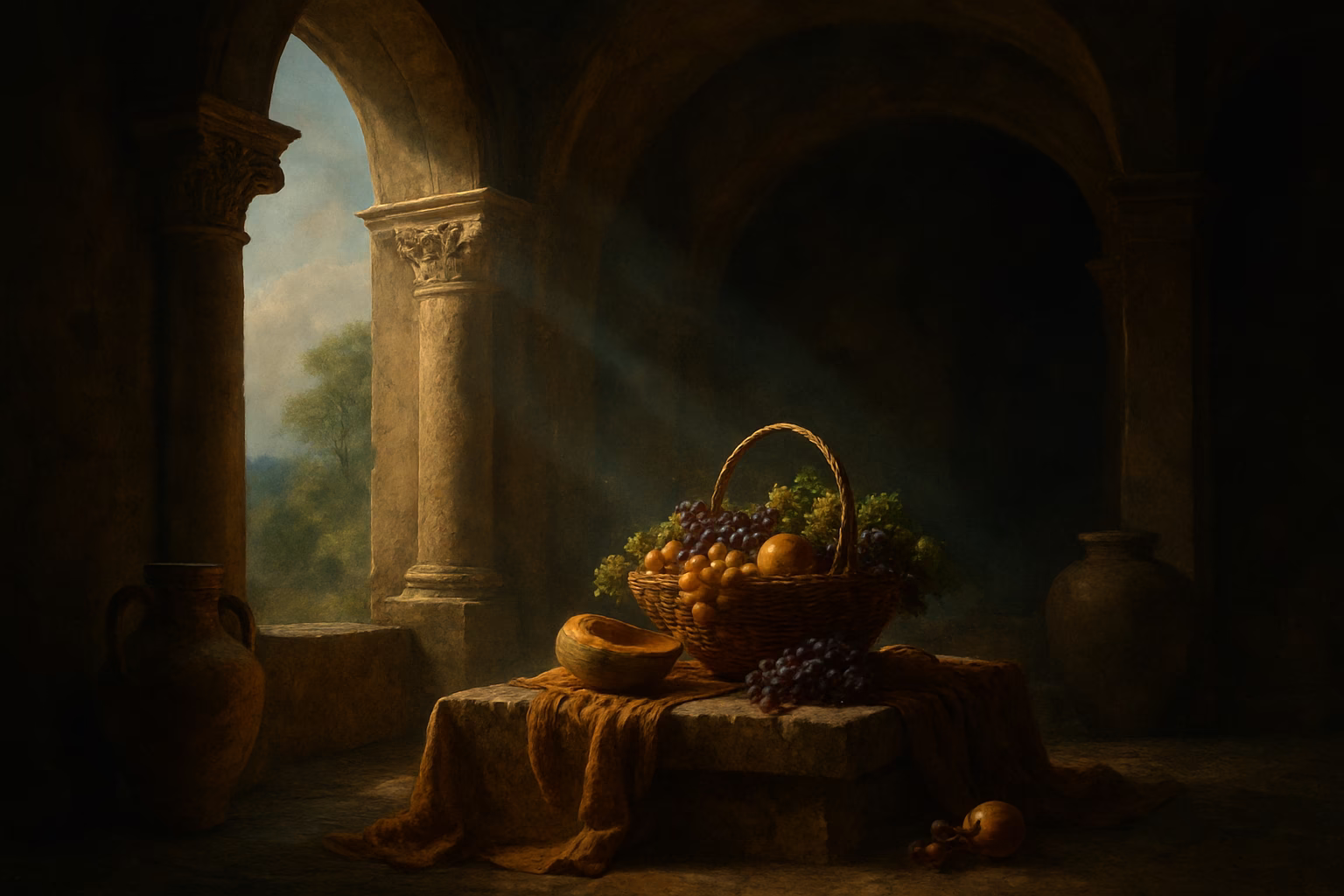This captivating still life image features a beautifully arranged basket of fruits in a softly lit environment. Dominated by earthy tones like browns and beiges, the scene is accentuated by hints of g...