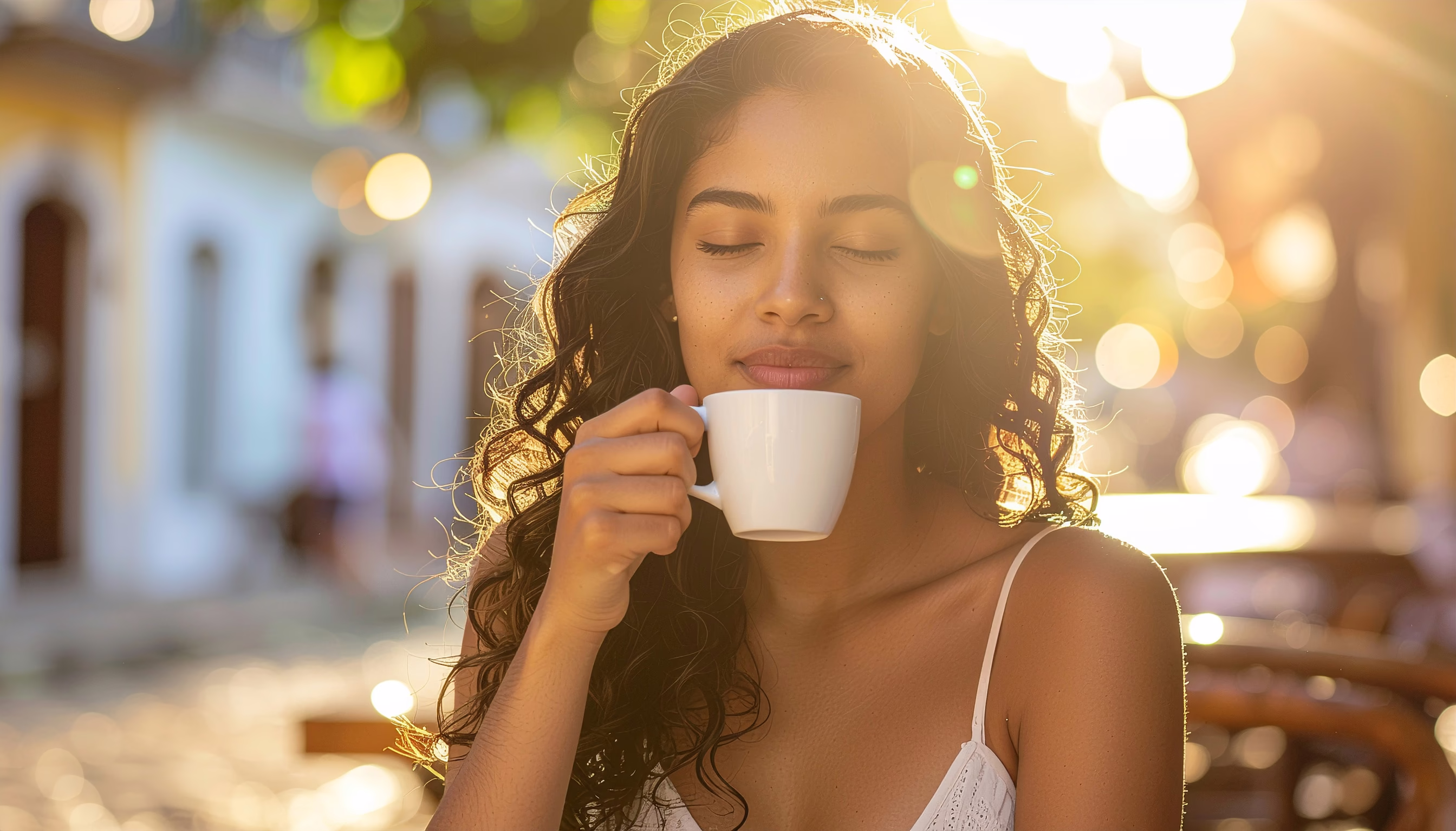 A woman enjoys a cup of coffee in an outdoor setting, bathed in soft sunlight, evoking tranquility and satisfaction on a calm morning. Perfect for those seeking a peaceful moment to savor their favorite beverage.