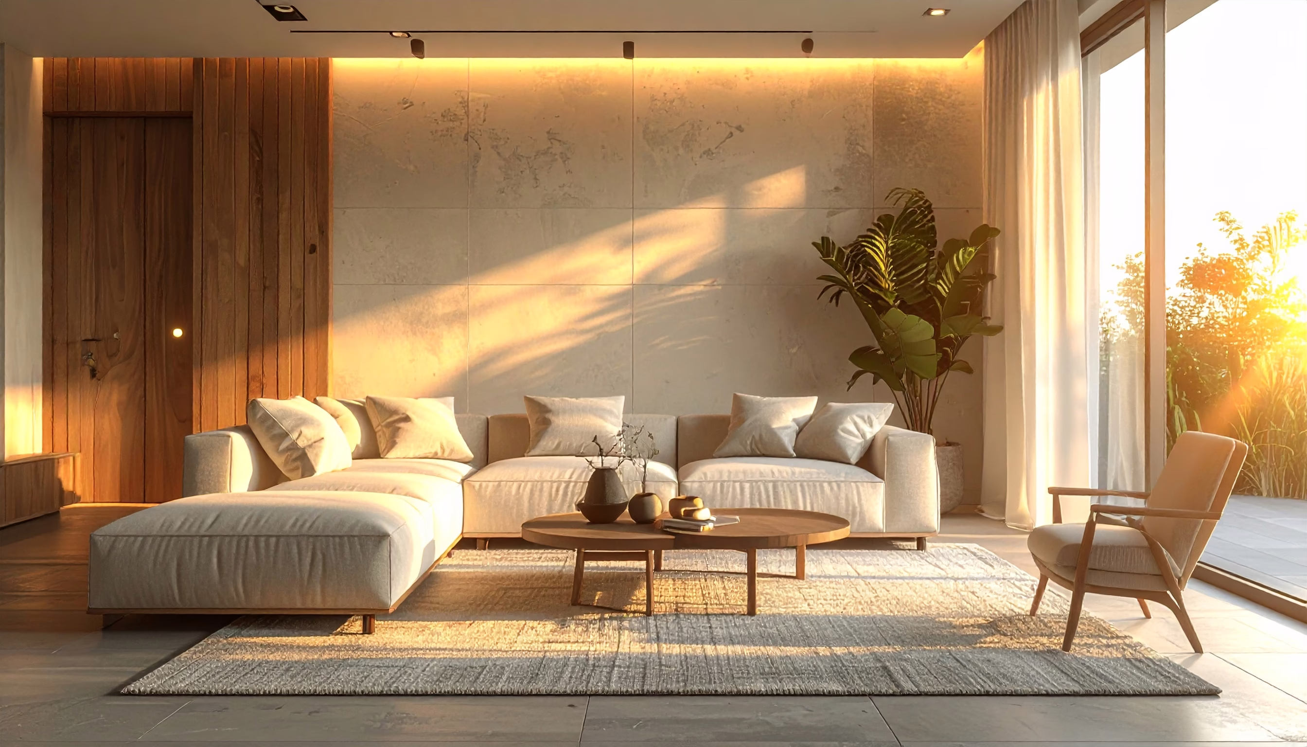 Explore this modern living room featuring a spacious beige sofa and a light wood coffee table on a textured rug. The warm glow of sunset pours through large windows, creating a cozy atmosphere and subtly illuminating the indoor plants, complemented by wooden panels and sheer curtains.