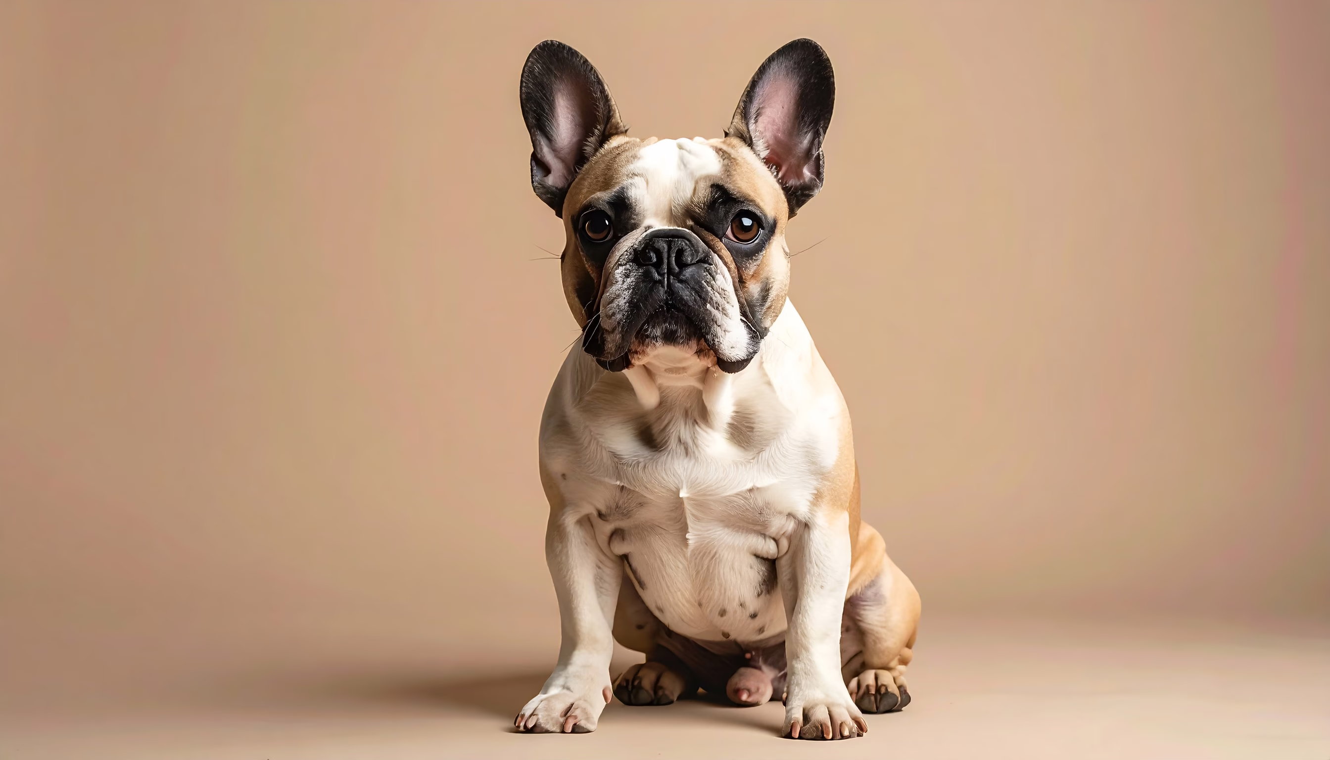 This charming French Bulldog sits against a neutral background, showcasing a curious and relaxed expression. The soft lighting highlights its unique facial features, creating an atmosphere of tenderness and tranquility. Perfect for themes of pet ownership, love for animals, and canine lifestyle.