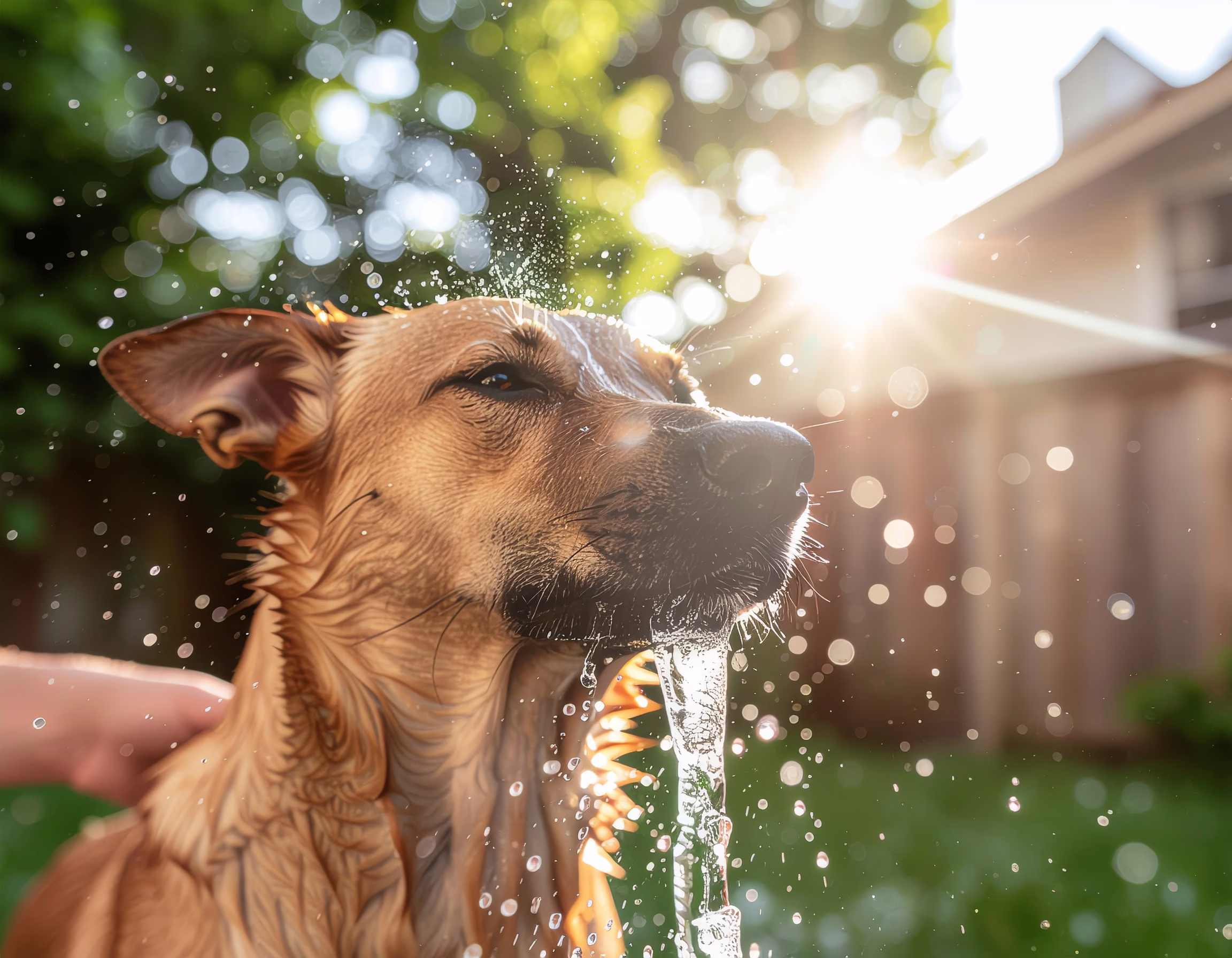 A wet dog being petted in a garden, with water droplets captured in motion against bright sunlight, creating a bokeh effect. This scene conveys a sense of freshness and joy, featuring vibrant colors and a dynamic composition that highlights the focus on the animal. Natural lighting and a shallow dof