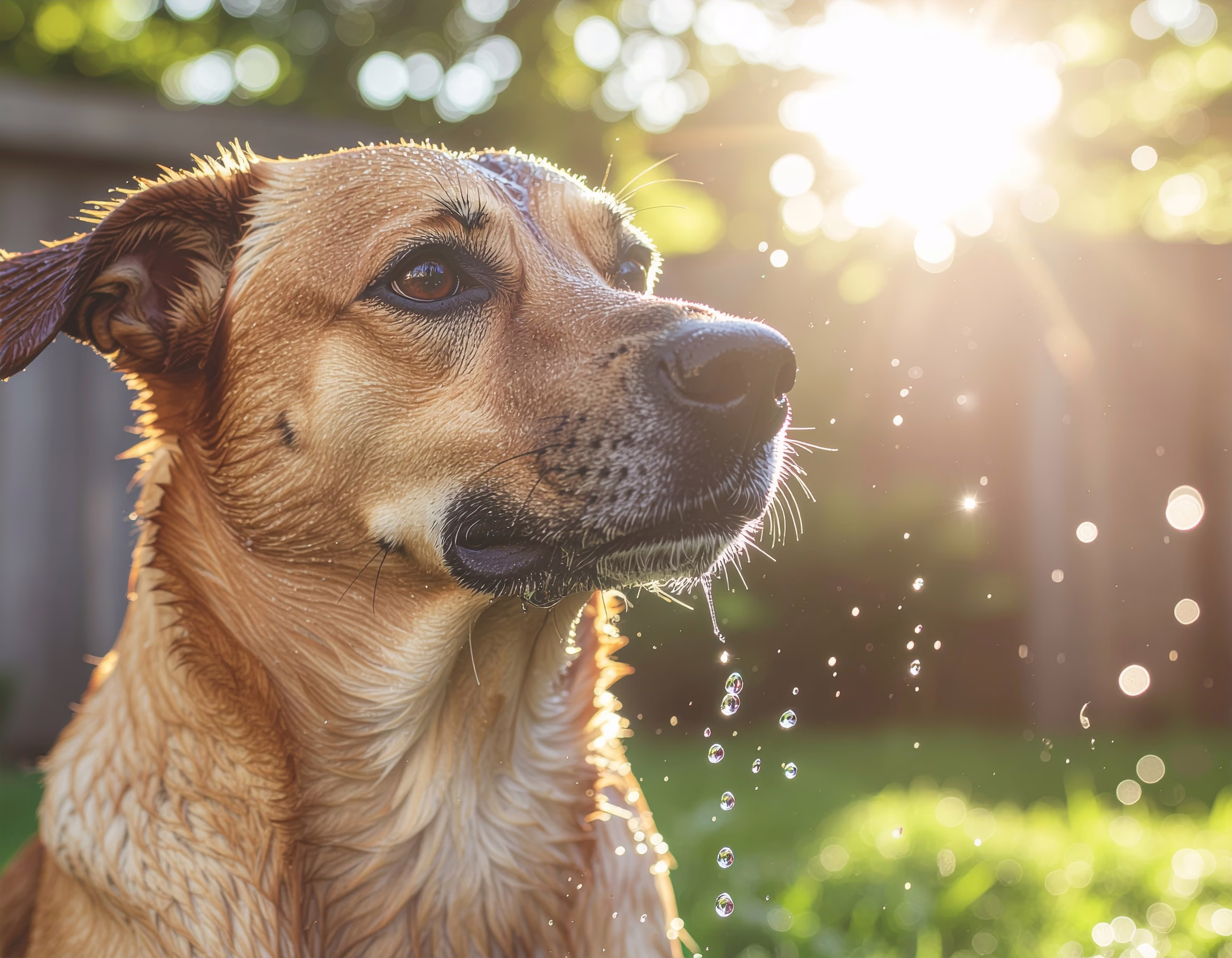A close-up of a wet dog outdoors, showcasing water droplets cascading down its face. The sunset lighting creates a soft glow and bokeh in the background. The wet fur reflects light, adding texture to ...