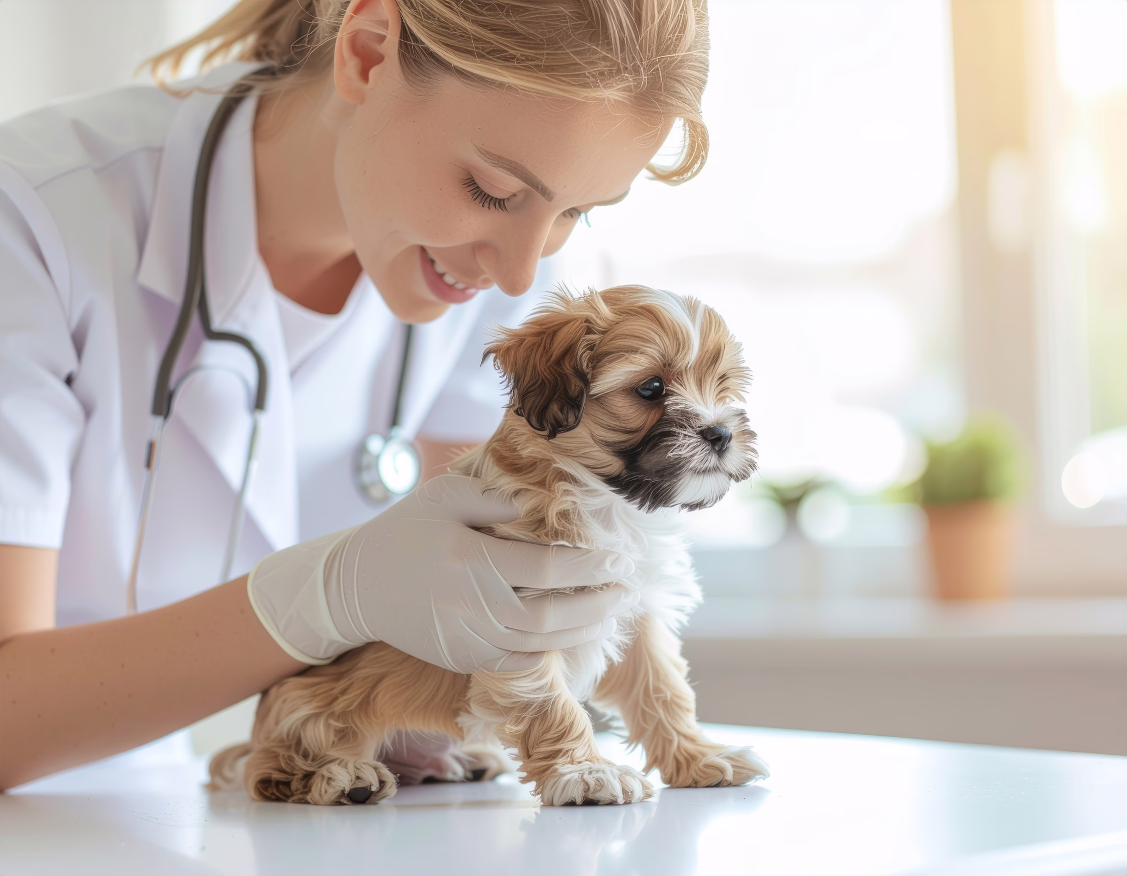 A smiling veterinarian examines a puppy in a bright clinic. The space is well-lit with soft natural light streaming through the window, creating a warm atmosphere. The focus is on the puppy, with the ...