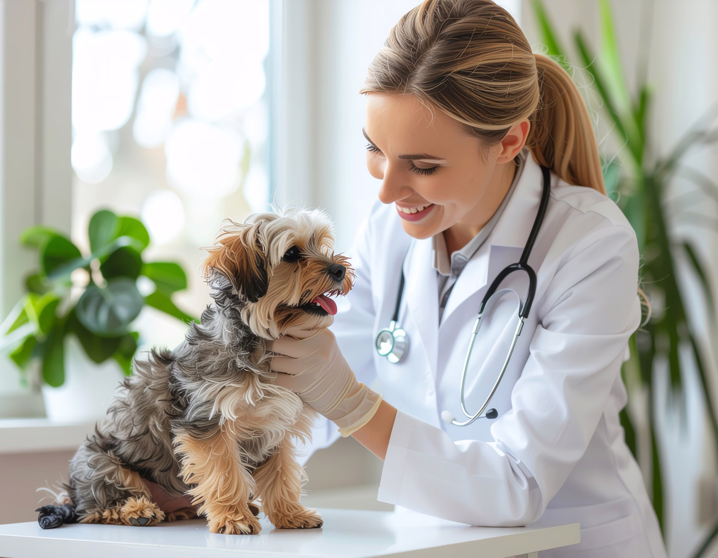 A smiling veterinarian gently examines a small dog in a well-lit clinic, creating an atmosphere of care and professionalism in a modern veterinary environment. Perfect for showcasing the bond between ...