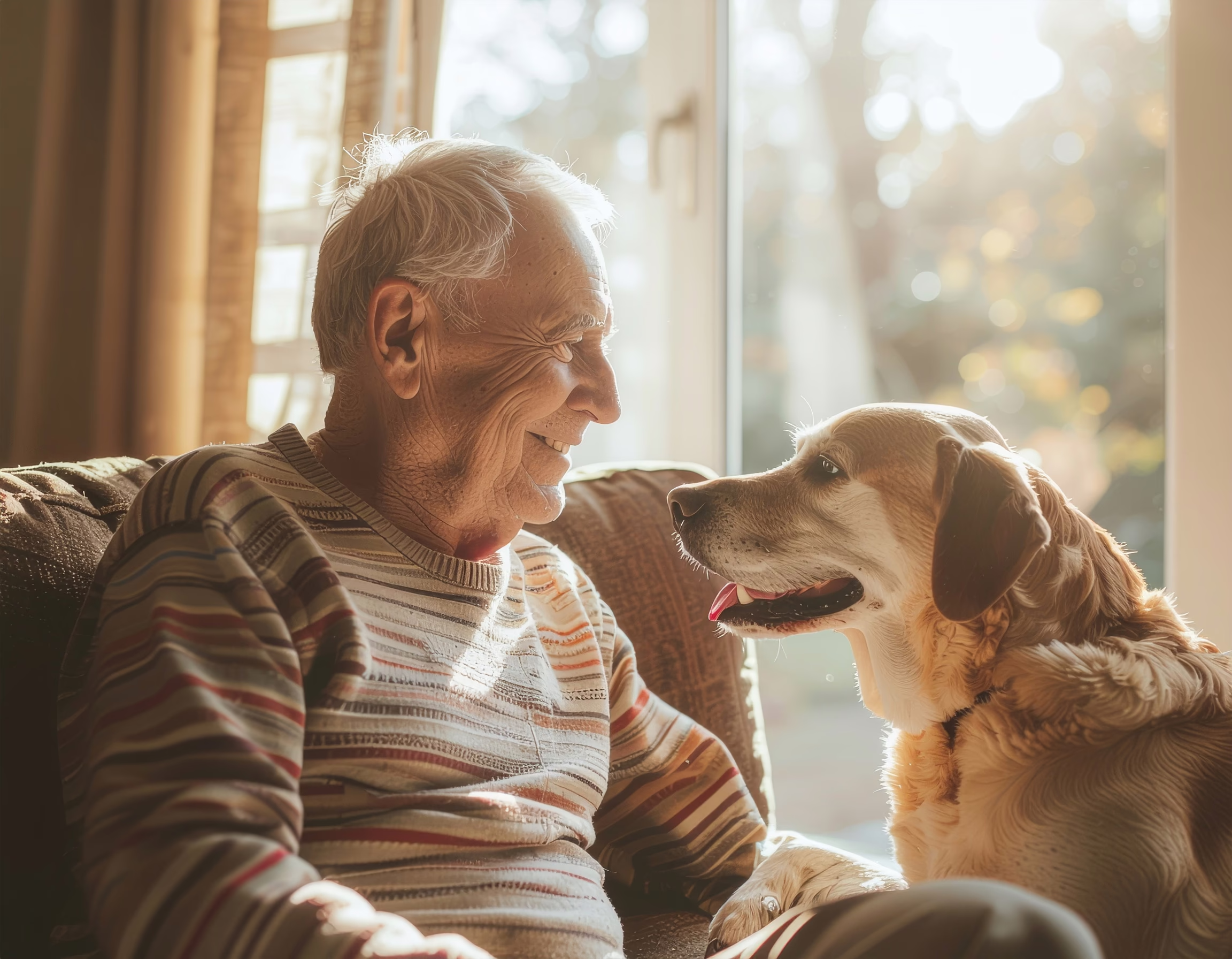 An elderly man sits comfortably on a sofa next to a dog, both bathed in the soft sunlight streaming through the window. The warm colors of the cozy environment create a tranquil and friendly atmosphere. The man's smiling expression and the dog's attentive gaze evoke a deep emotional connection. This