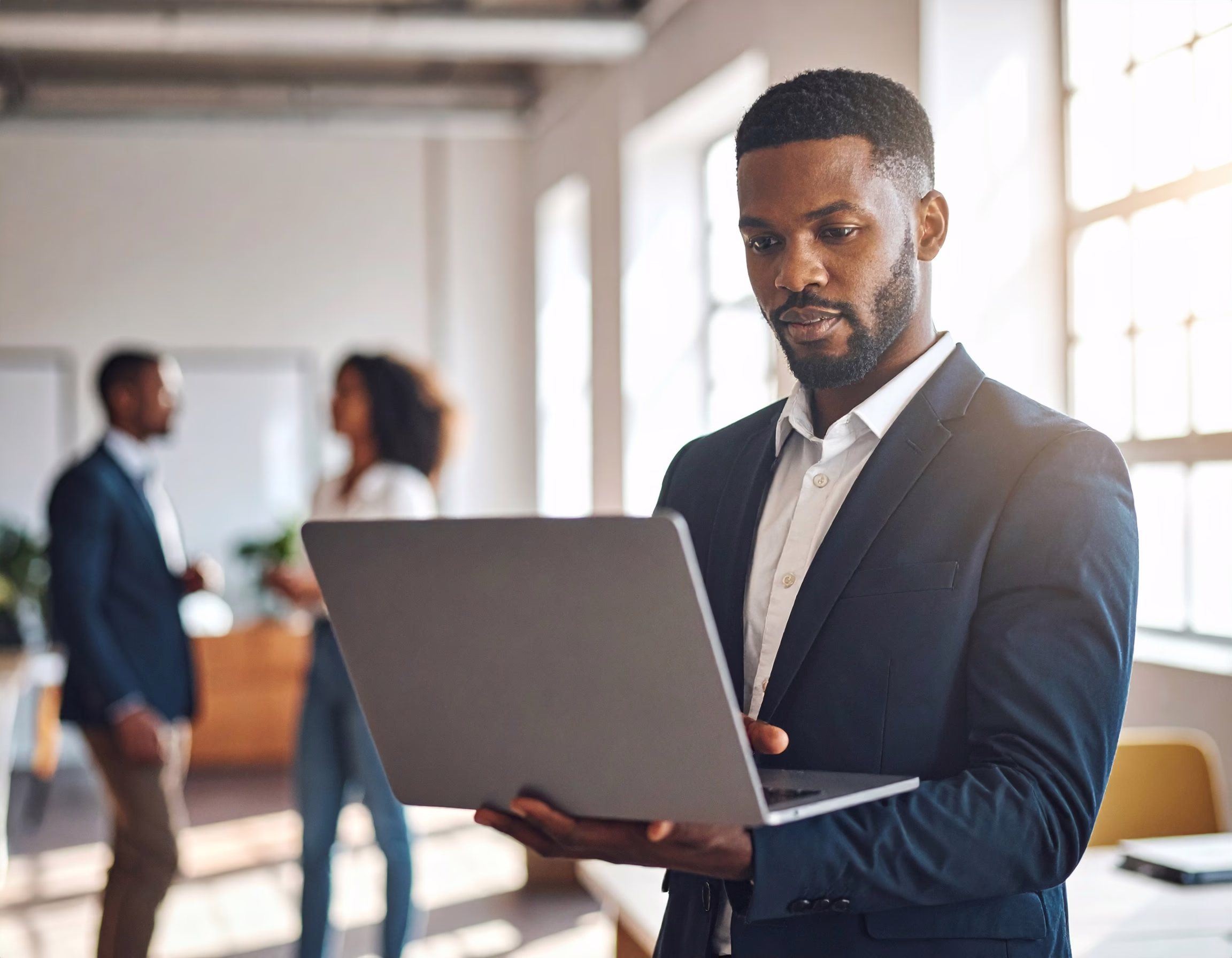 A businessman in a dark suit holds a laptop in a bright office illuminated by natural light, with two blurred individuals in the background engaged in discussion. This scene captures a modern and coll...