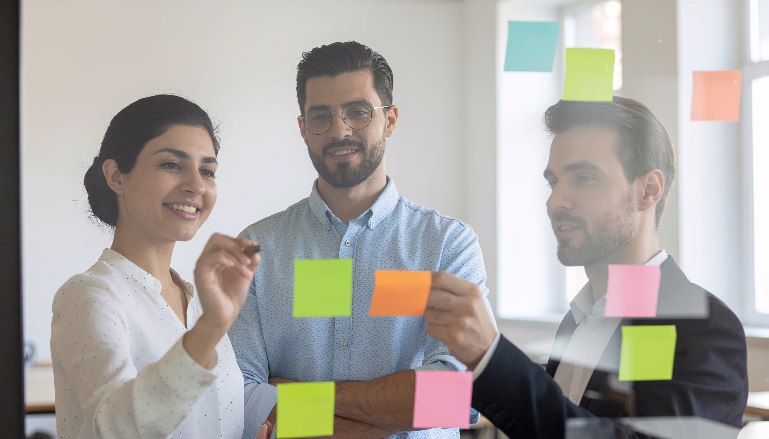 Three individuals collaborate in a creative meeting within an office environment, utilizing colorful sticky notes on a glass board. Soft natural light filters through the windows, fostering an atmosph...