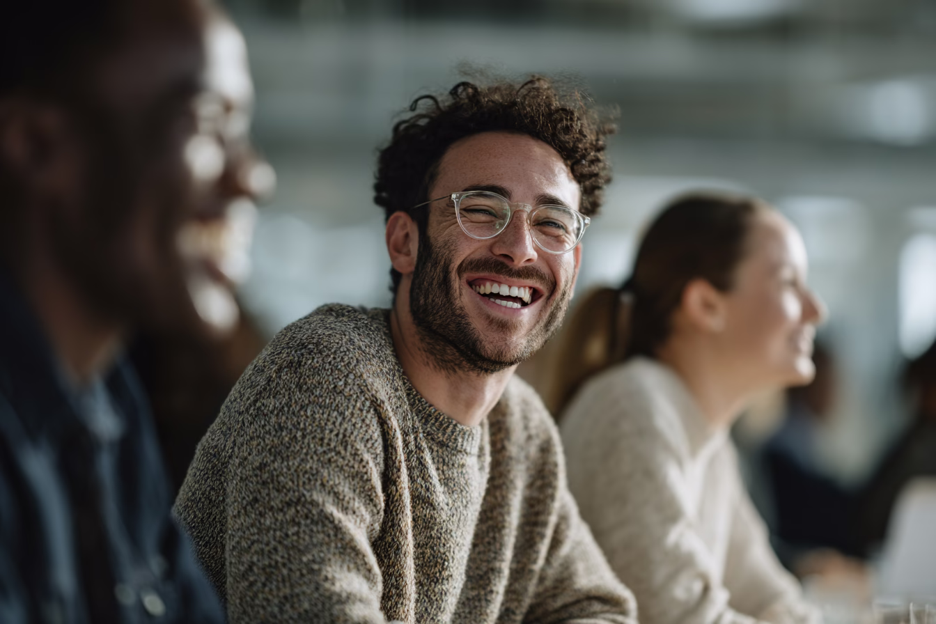 A vibrant group of smiling young professionals in a modern office setting, featuring a curly-haired man with glasses who radiates joy and camaraderie. This image beautifully captures the essence of collaboration and social interaction in a workplace environment.