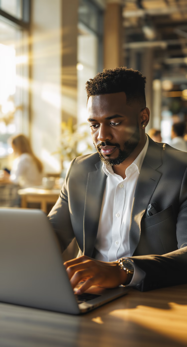 A stylish man in a gray suit sits in a modern, well-lit café, typing on his laptop. The golden sunlight streams through the windows, creating a soft and inviting atmosphere, while the blurred background suggests a bustling environment.