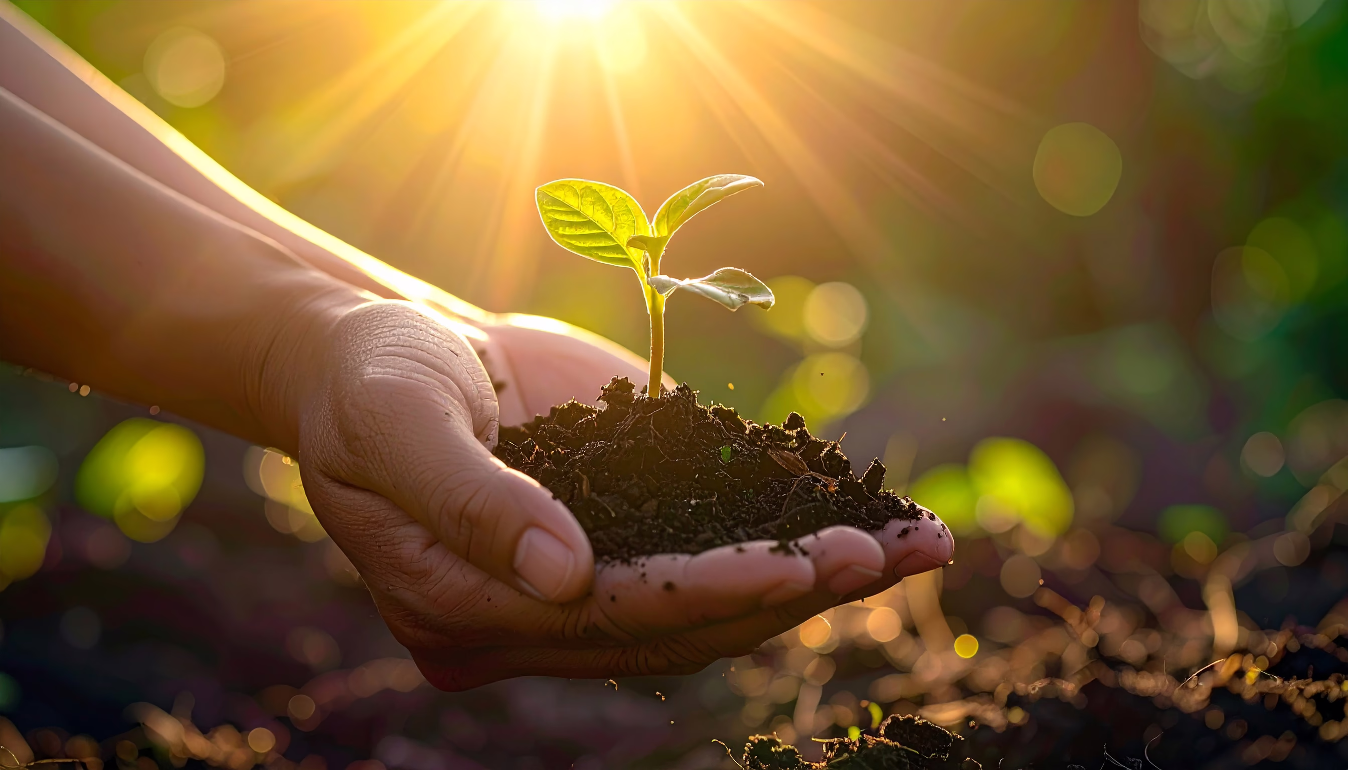 Hands gently holding a young plant in dark soil, illuminated by soft sunlight that creates a golden halo effect, symbolizing growth and environmental care. The image captures the texture of the earth and the freshness of the leaves, with precise focus and a blurred background that adds depth and a感e