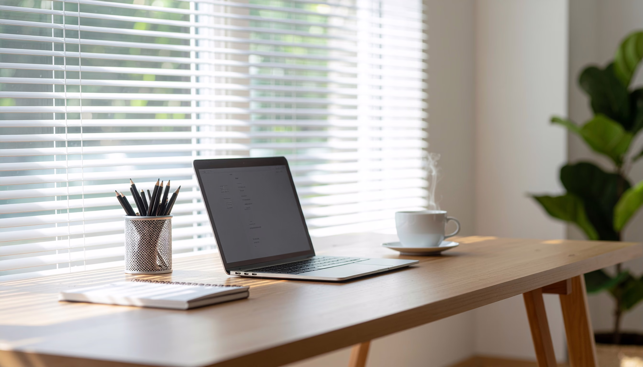 Discover a minimalist office scene featuring a laptop on a light wood desk. To the right, a steaming coffee cup adds warmth, while a pencil rests in a metallic pencil holder on the left. The white blinds filter natural light, creating a soft and bright atmosphere. A green plant in the corner brings