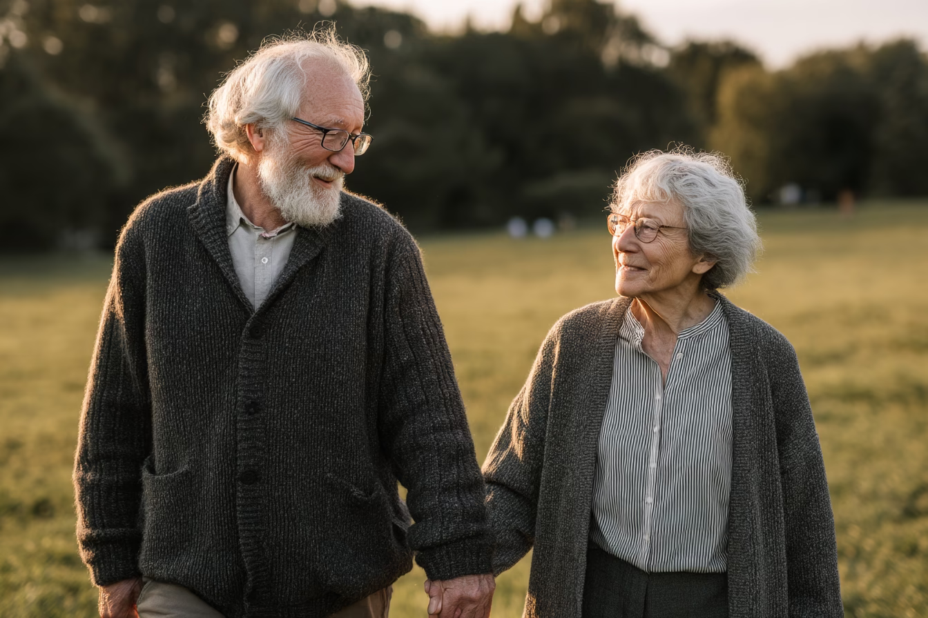 An elderly couple walking hand in hand in a field at sunset, showcasing love and companionship. The man has gray hair and a beard, while the woman has short hair and wears glasses. Both are dressed in cozy sweaters, set against a tranquil natural backdrop.