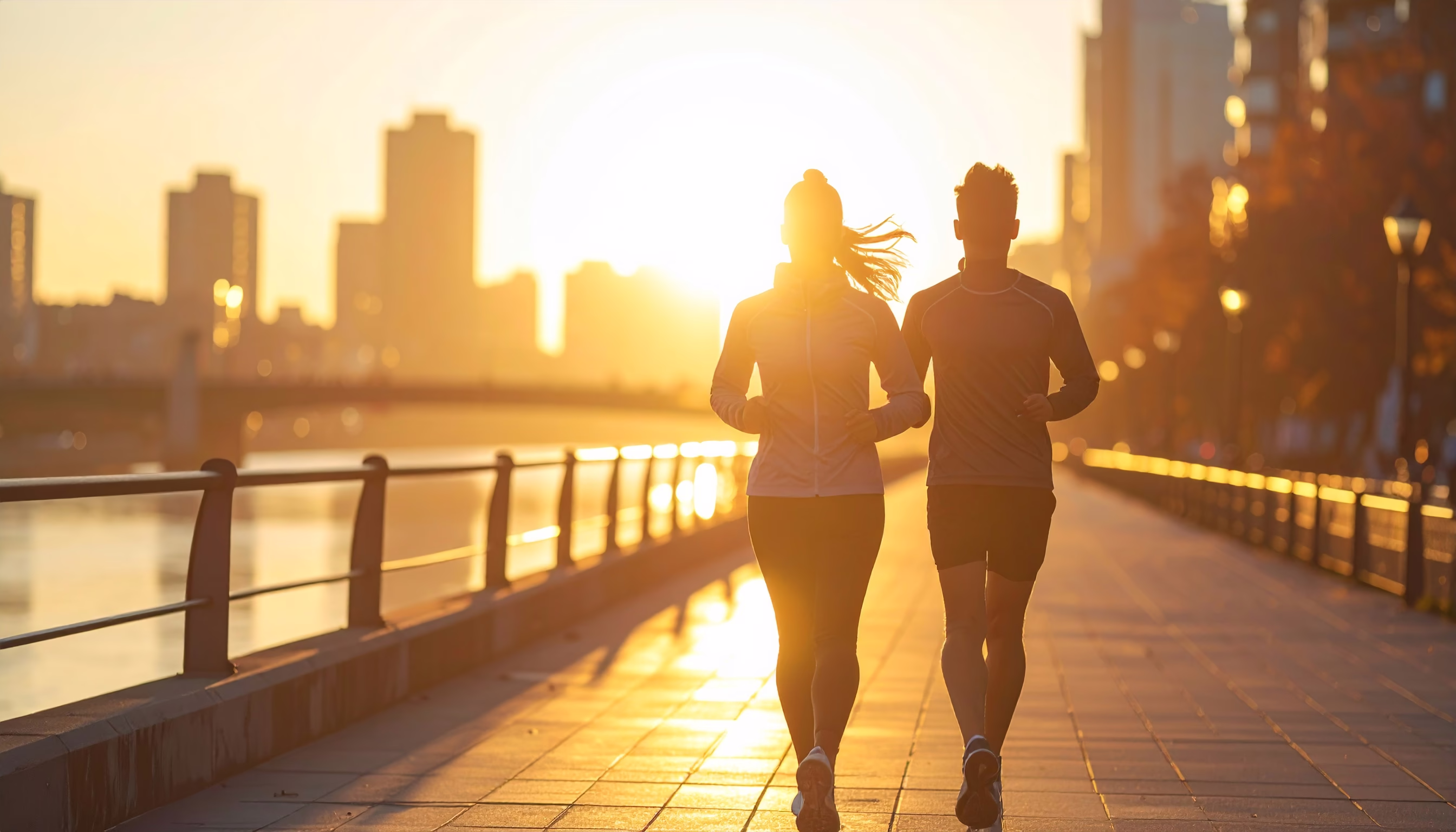 Two runners jog side by side on an urban walkway at sunrise, with the sun creating a dramatic silhouette in the background. The warm light of the rising sun reflects off the buildings and the water ne...