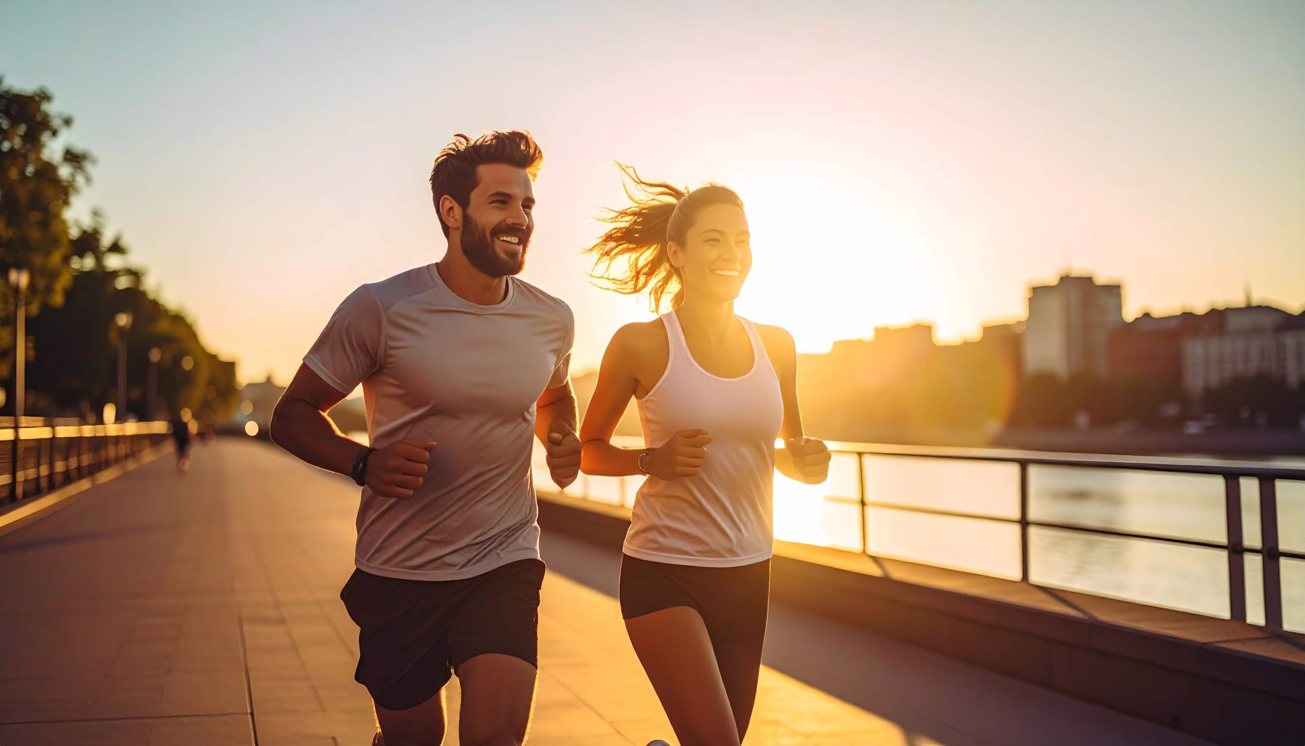A couple running joyfully along the waterfront at sunset, with golden lighting highlighting their silhouettes against the orange sky and buildings in the background. Both are wearing comfortable sportswear, captured in a fluid and natural movement.