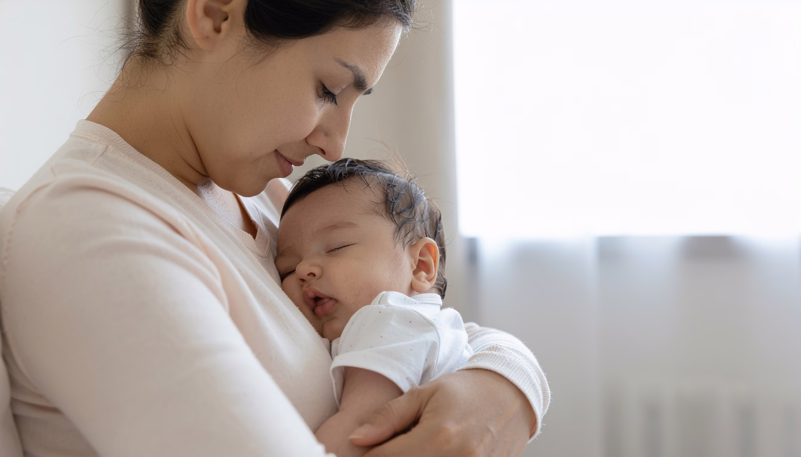 A serene image of a woman cradling a sleeping baby in her arms, bathed in soft lighting with a blurred background. This tranquil and loving atmosphere highlights the peaceful expressions of both the mother and child, emphasizing their emotional bond and connection.