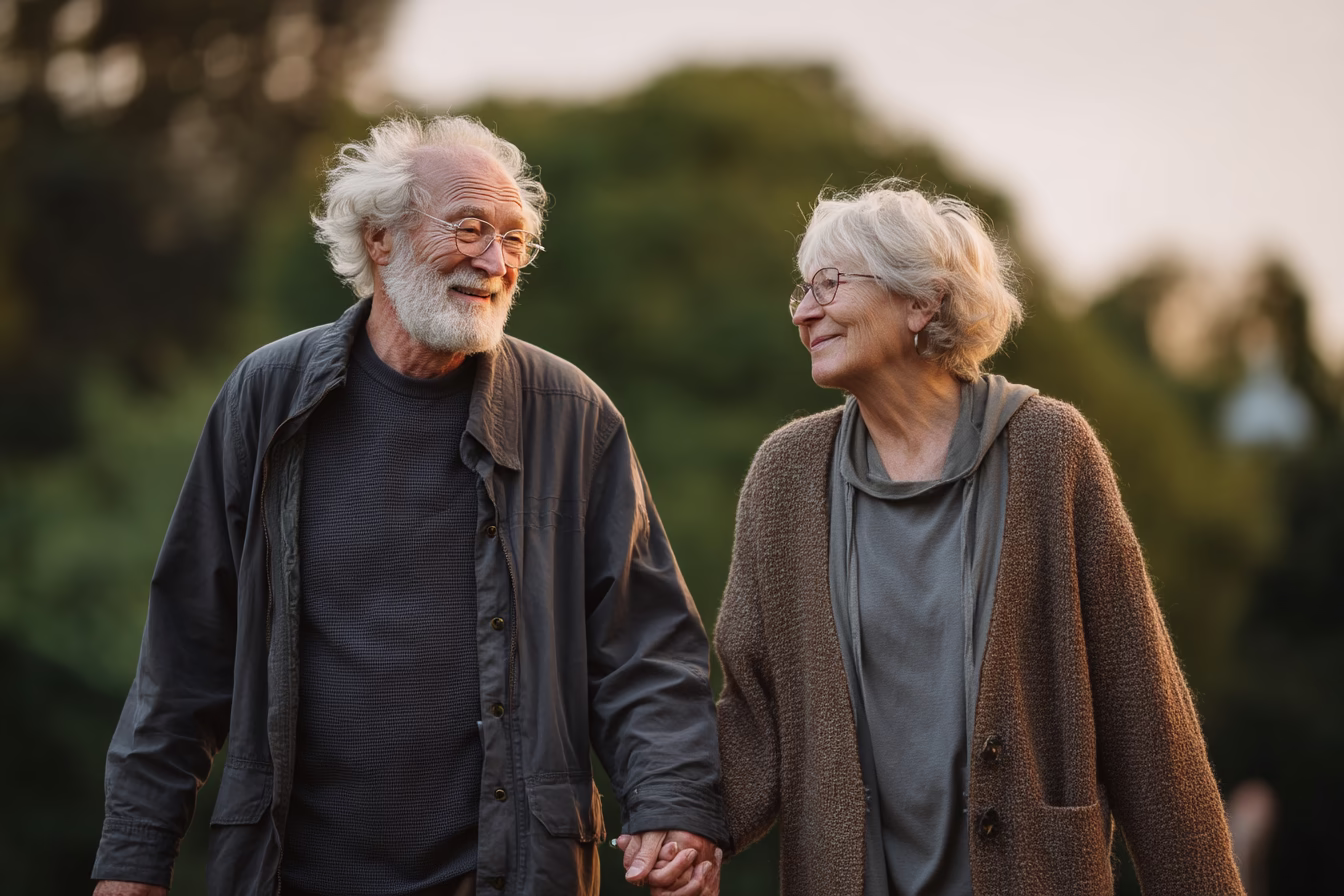 An elderly couple smiles as they walk hand in hand in a park during sunset, surrounded by nature. Dressed in casual and comfortable clothing, they embody love and happiness in their golden years. Perfect for showcasing the beauty of relationships in later life.