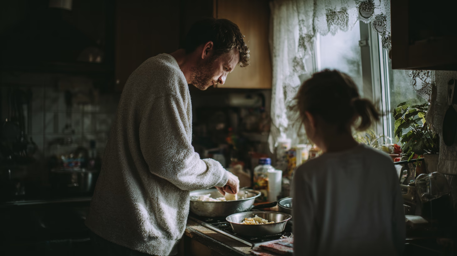 A father and daughter are preparing food in a cozy kitchen filled with natural light, showcasing their family interaction and the joy of cooking together. This warm and inviting scene captures the essence of family bonding through culinary activities.