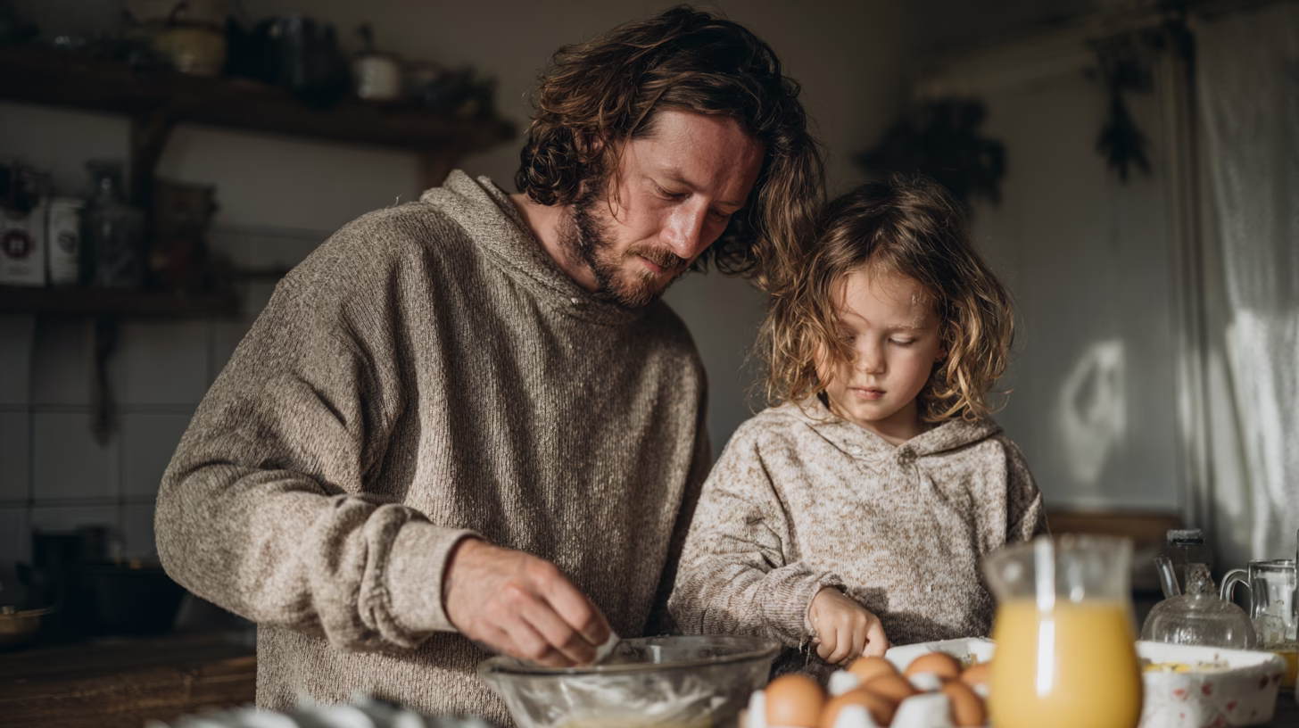A father and his young daughter are cooking a meal together in the kitchen. The father, wearing a light sweater, is mixing ingredients in a bowl while the child watches closely. In the background, there's a table with eggs and a pitcher of juice. This scene captures moments of family connection and,