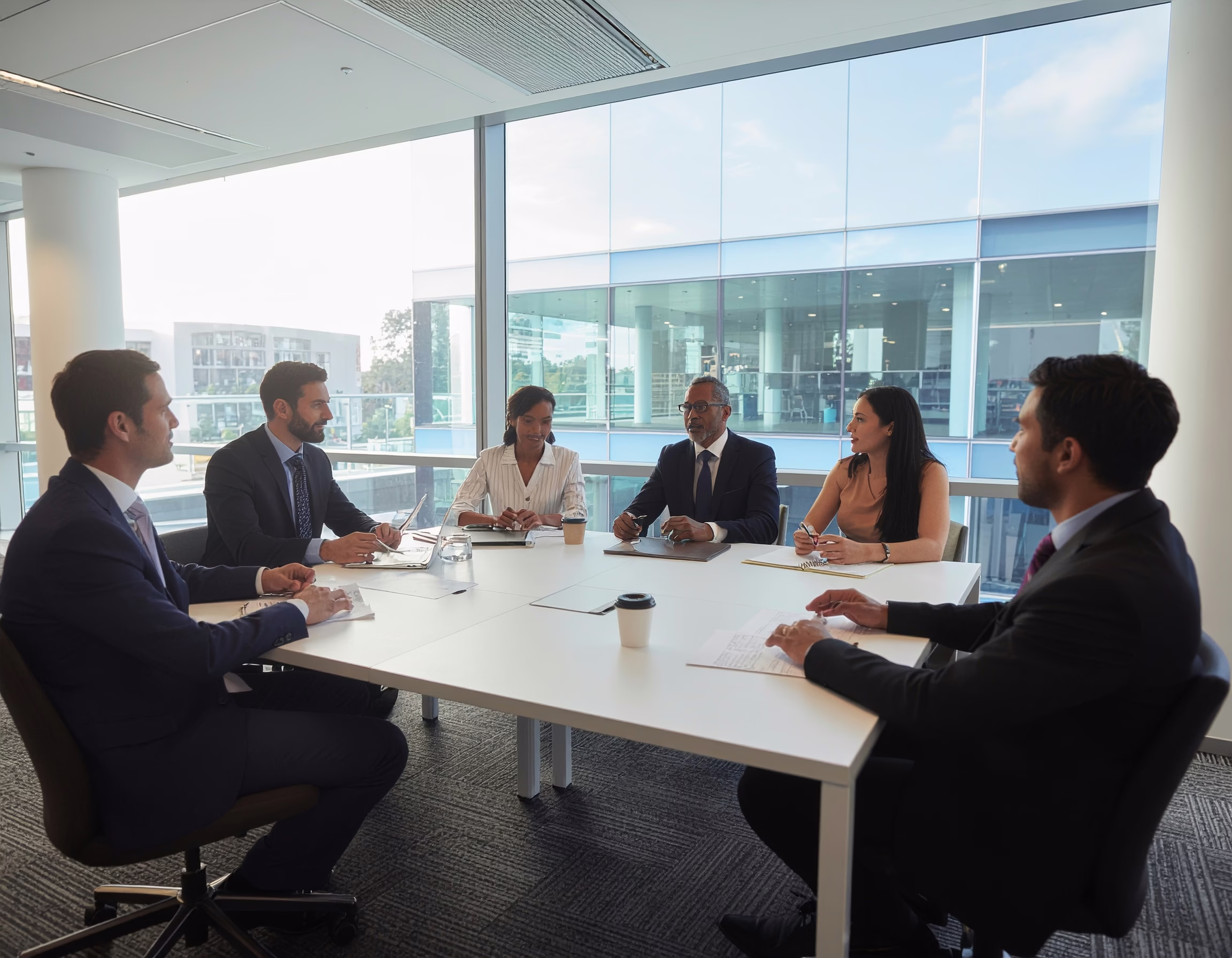 This image is classified with the tags: corporate meeting, professionals, conference room, large windows, natural light.