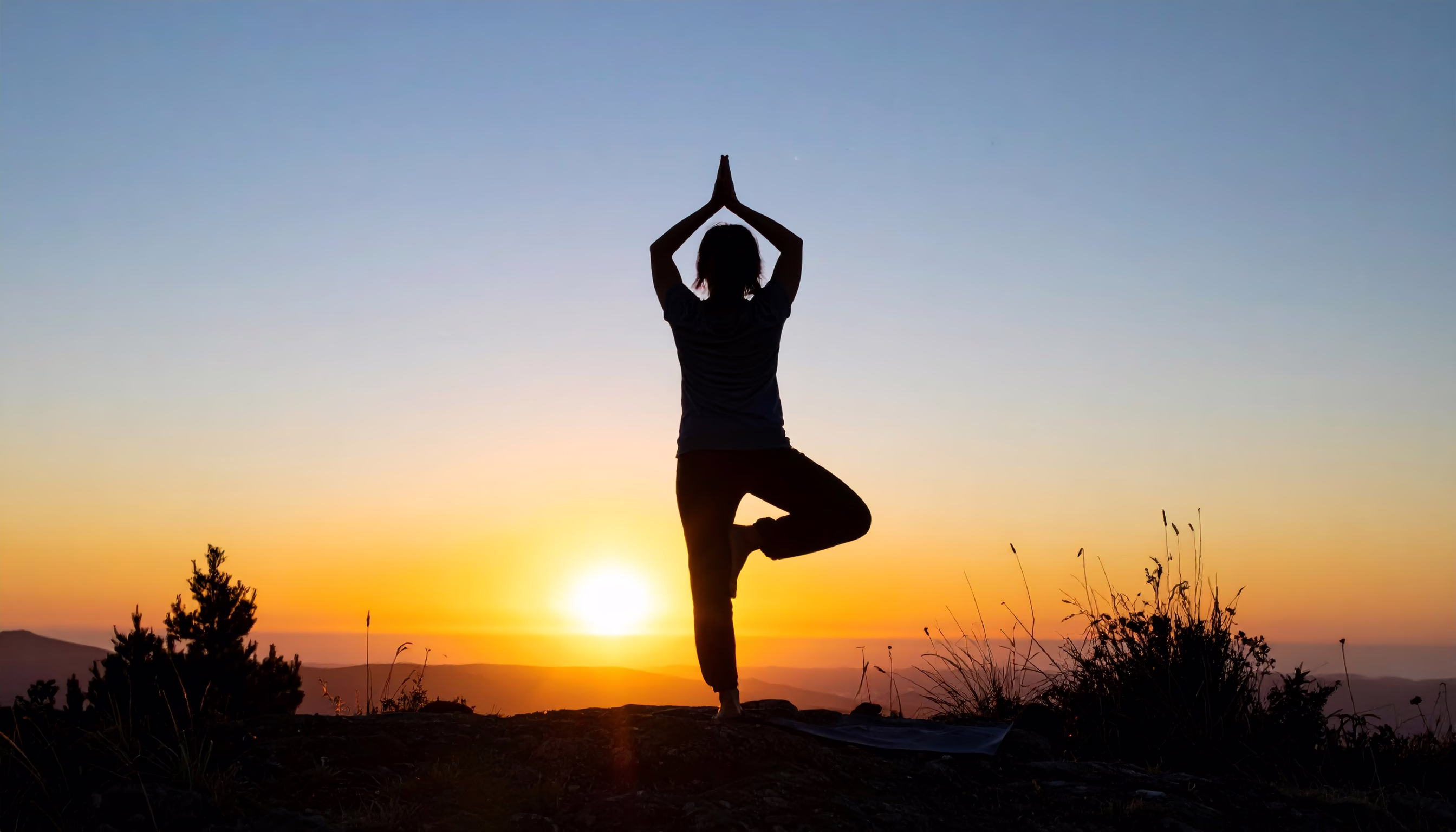 Capture the serene moment of a yoga silhouette against a stunning sunset, featuring vibrant orange and blue skies, a mountainous backdrop, and lush dark vegetation in the foreground. Perfect for promo...