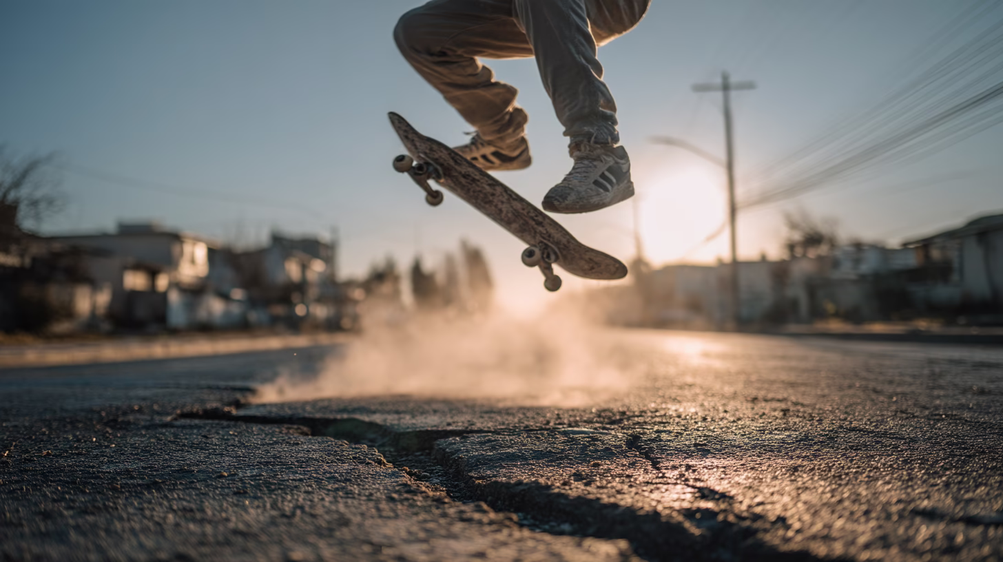 This image showcases a skateboarder in motion, leaping over a crack in the street. The warm hues of orange and yellow in the background suggest a sunset, contrasting with the gray asphalt. Soft lighting creates a halo effect around the skateboarder and the dust being kicked up. The skateboarder is a