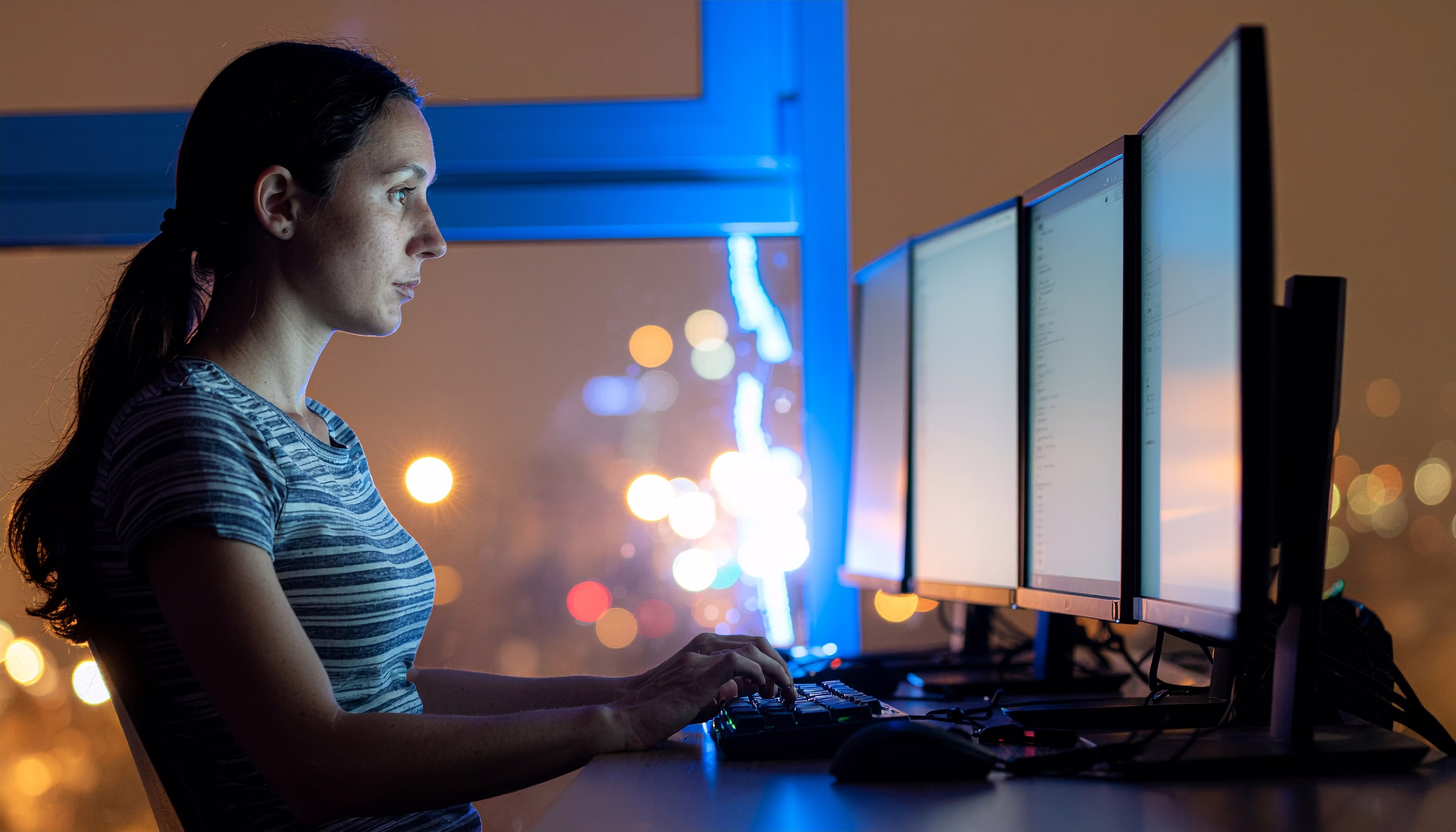 A woman is typing on a keyboard in a dimly lit night office, surrounded by multiple monitors. The city lights in the background create a beautiful bokeh effect, enhancing the soft lighting and focused...