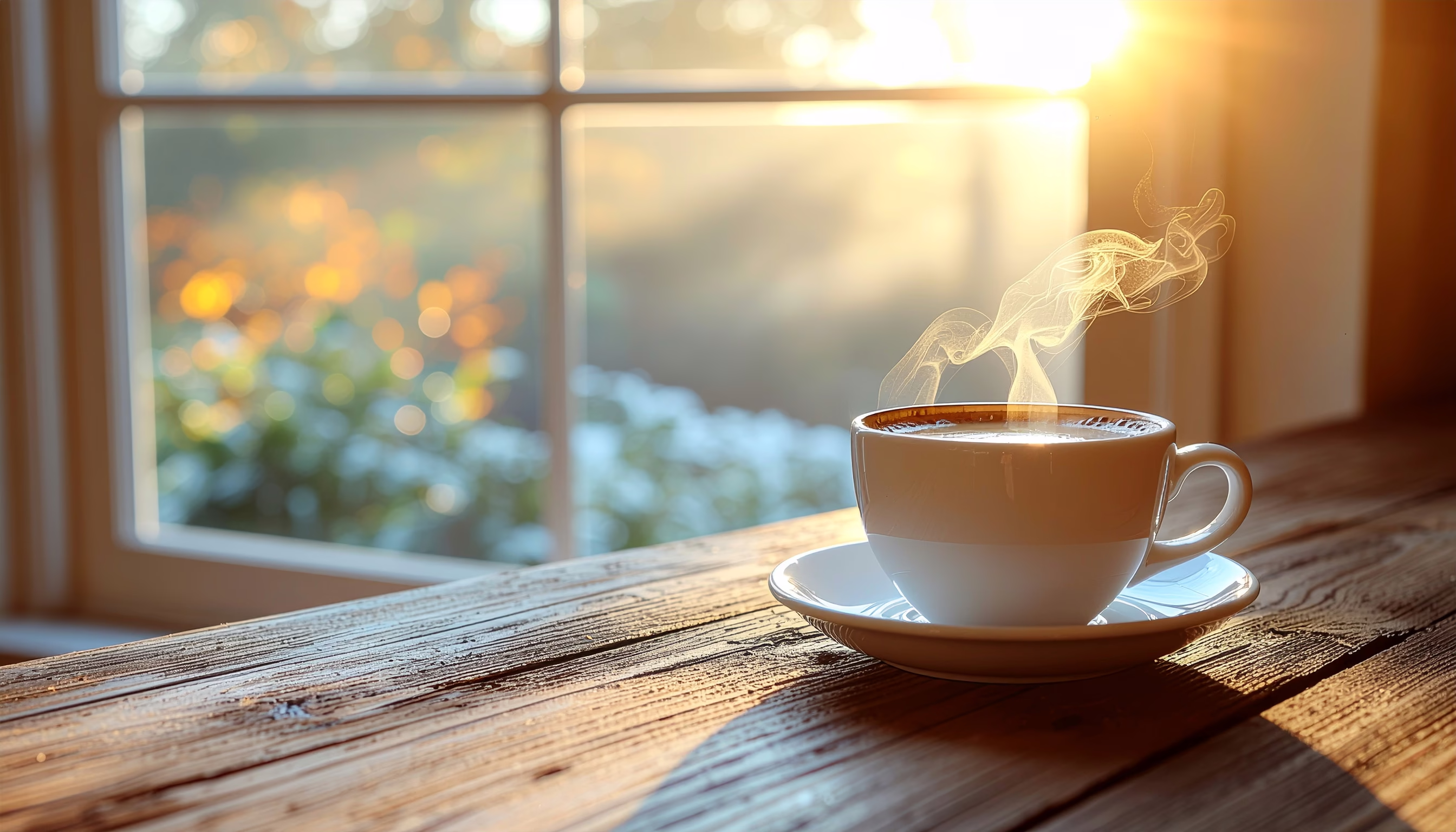 This image is classified with the tags: coffee cup, steaming coffee, wooden table, morning sunlight, cozy atmosphere.