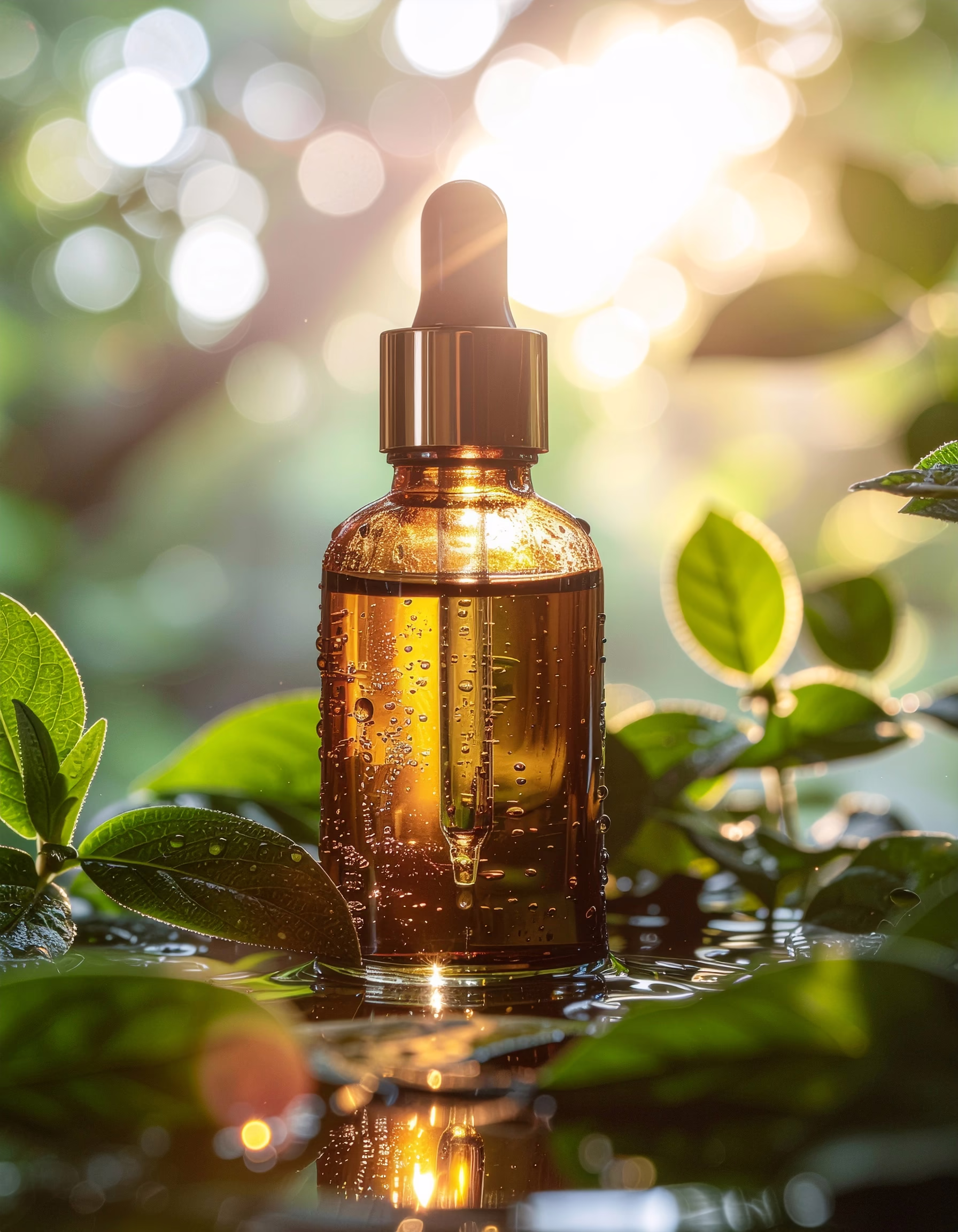 Discover the beauty of this amber glass dropper bottle nestled among vibrant green leaves. Bathed in soft sunlight with a bokeh background, this image evokes a sense of freshness and purity, highlighted by sparkling reflections on the wet surface. Perfect for showcasing natural products or wellness,