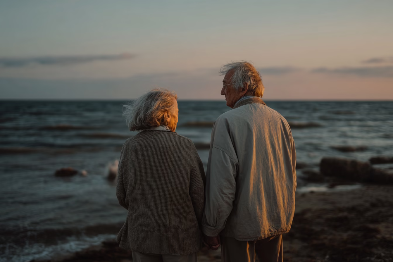 An elderly couple holding hands by the sea during sunset, with gentle waves in the background, creating a peaceful and romantic atmosphere. Perfect for capturing love and tranquility in your projects.