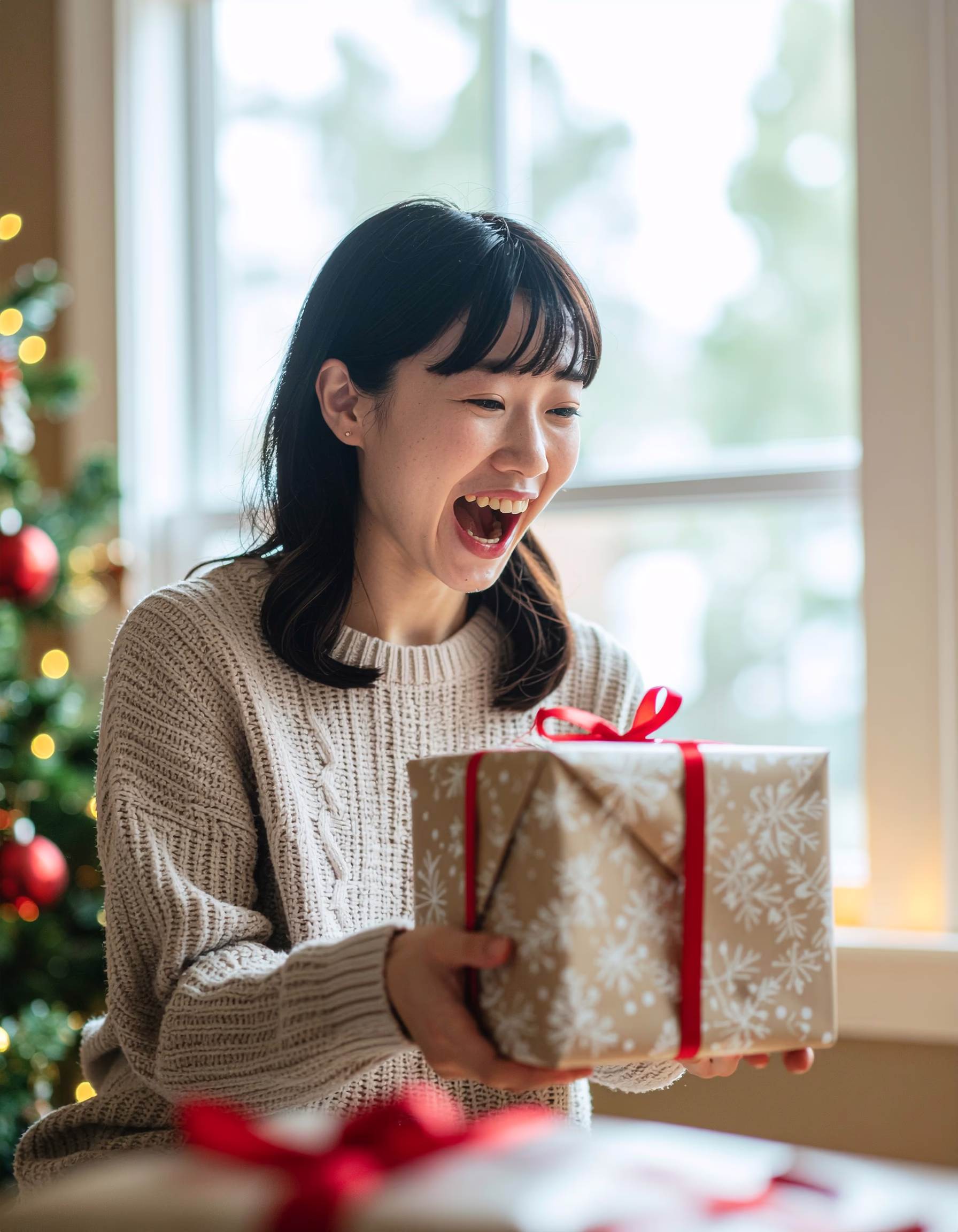 A cheerful woman is holding a beautifully wrapped gift adorned with snowflakes and a red ribbon, set in a festive environment with a Christmas tree in the background. Soft natural light streams through the window, creating a joyful and expectant atmosphere perfect for the holiday season.
