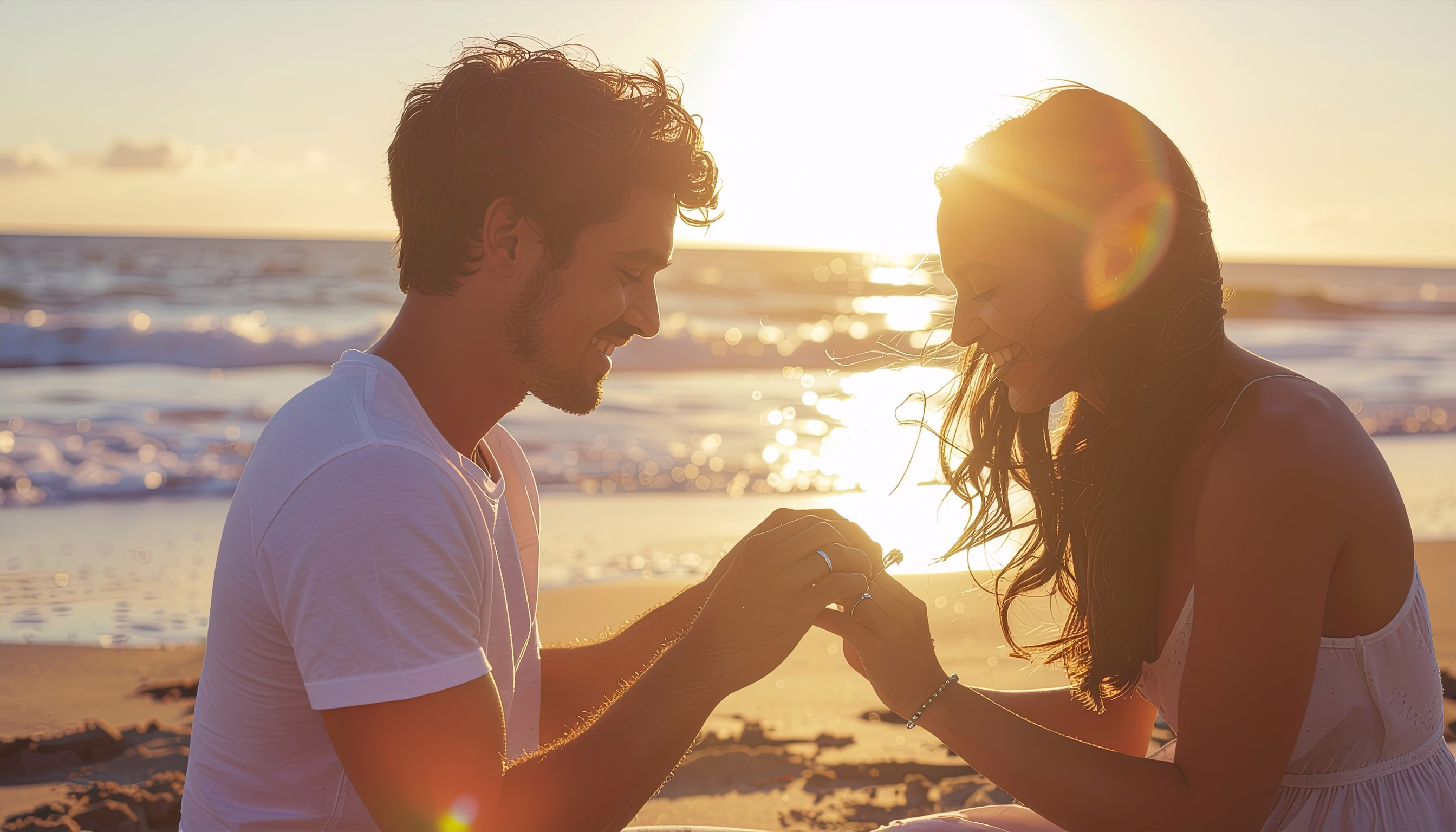 A couple enjoys a serene moment on the beach during sunset, illuminated by golden light. The man places a ring on the woman's finger, capturing an intimate and joyful occasion. The gentle waves in the background enhance the feeling of love and tranquility, while the soft focus and depth of field add