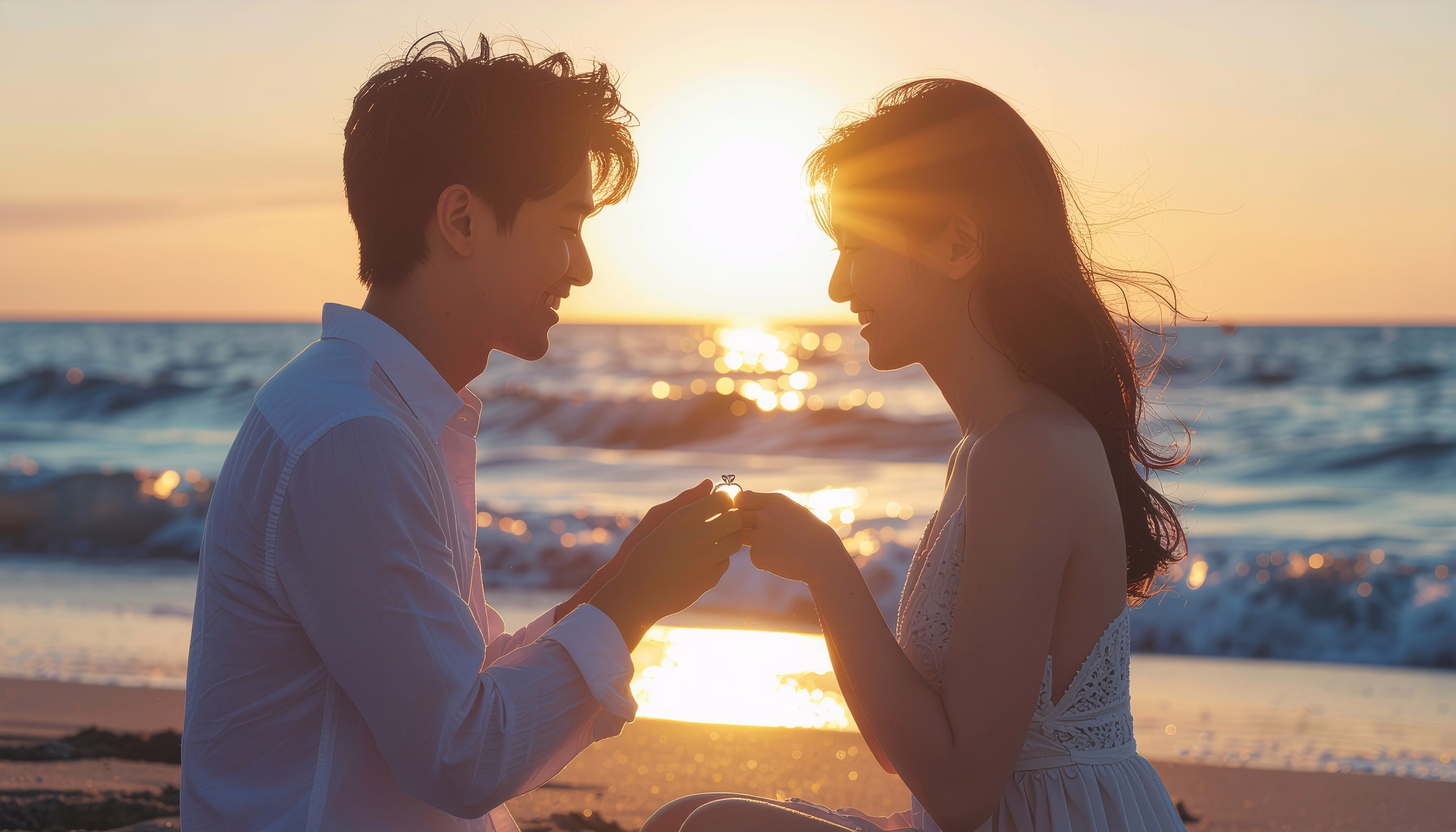 A couple on the beach at sunset, exchanging glances and holding hands, with the sun shining in the background. The golden light of the sunset creates a romantic and serene atmosphere, highlighting the...