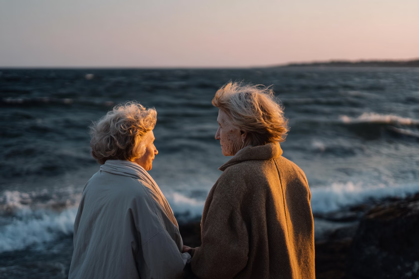 Two elderly women in warm coats enjoying the sunset by the sea, sharing a moment of friendship and emotional connection in nature. Perfect for capturing the essence of companionship and serene landsca...