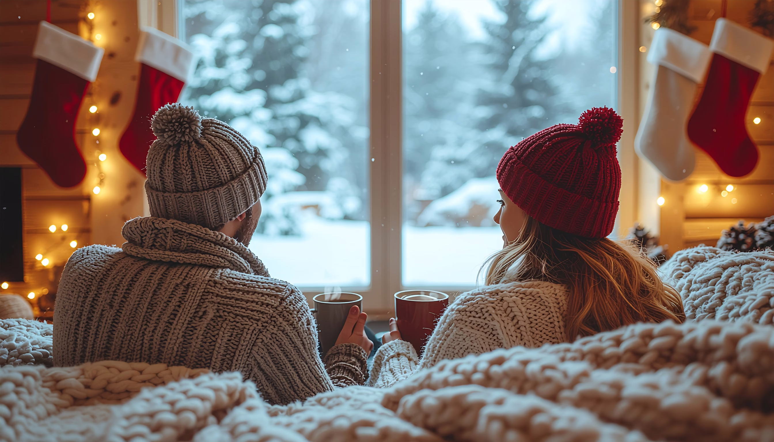 Experience the warmth of winter with this inviting image of two individuals wearing wool hats and cozy sweaters, holding mugs by a window. The interior is adorned with Christmas stockings and soft lights, creating a festive and welcoming atmosphere, perfect for holiday inspiration.