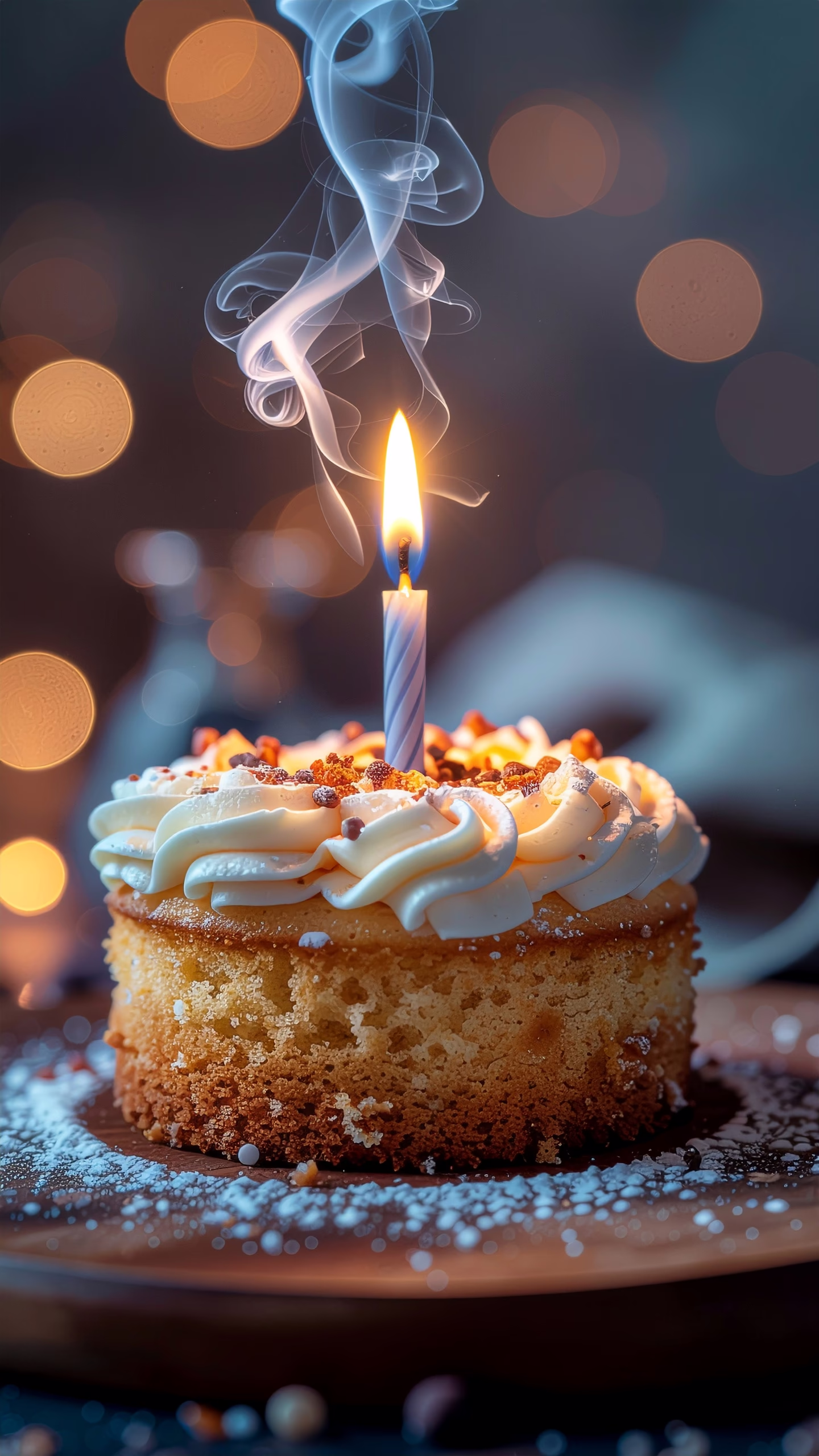 This beautifully crafted birthday cake features whipped cream and colorful sprinkles, topped with a lit candle at the center. The soft lighting enhances the candle's glow, creating a magical effect with a blurred background and bright bokeh. A charming and warm composition, perfect for intimatecele
