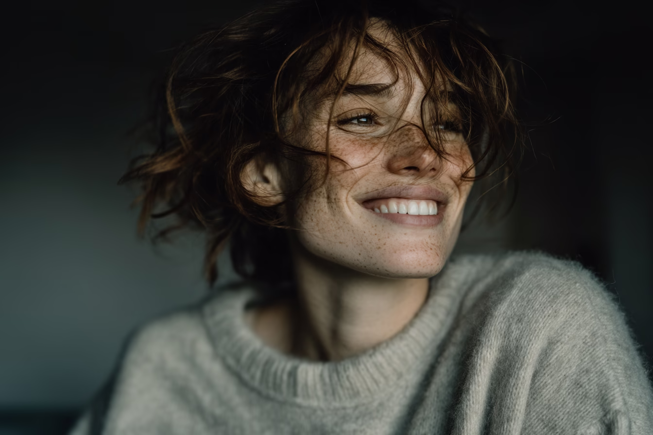 This portrait features a smiling woman with curly hair and freckles, dressed in a light sweater. Perfect for showcasing joy and warmth in your projects.
