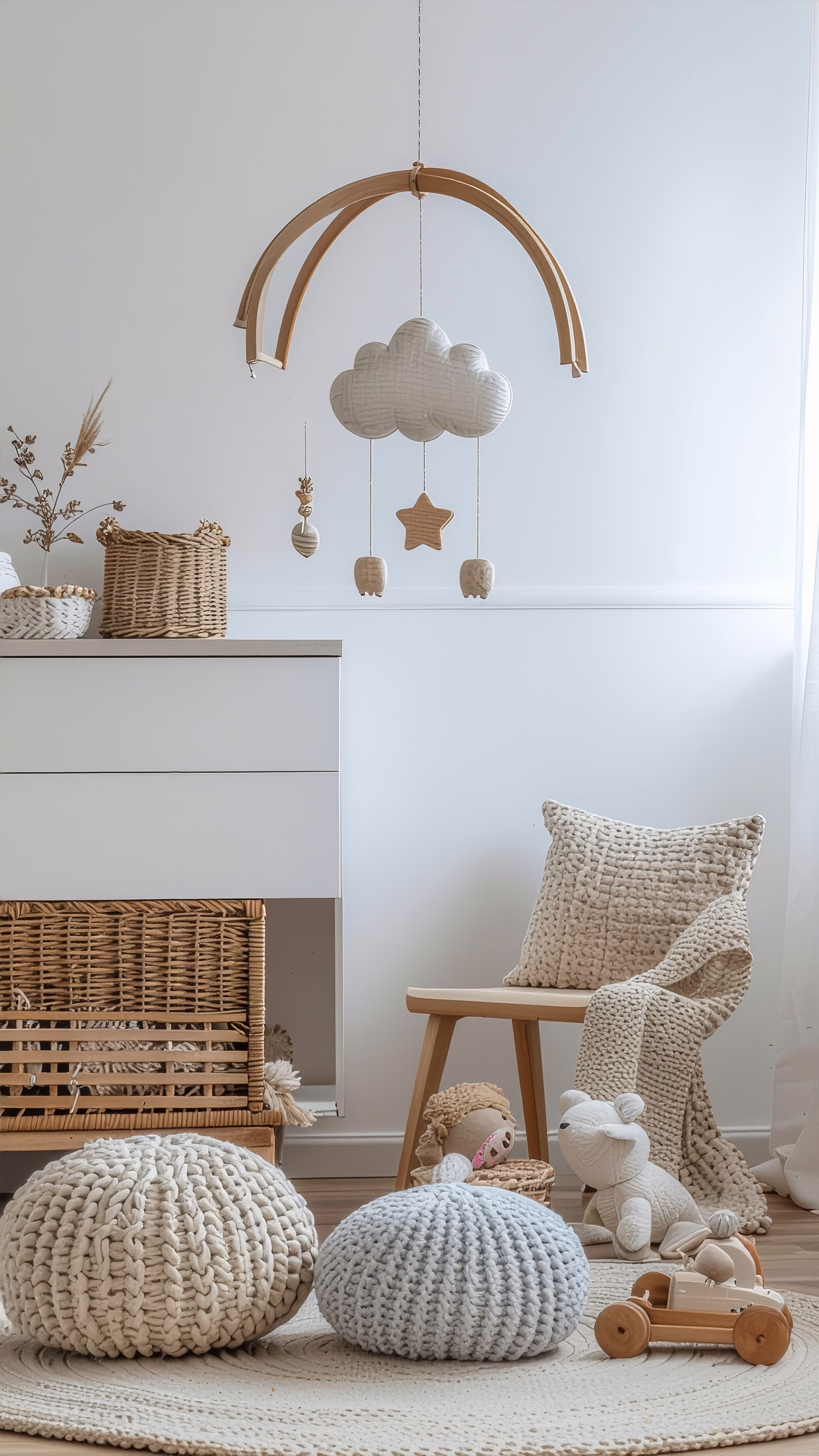 Explore this beautifully decorated kids room featuring neutral and soft tones. The standout mobile of clouds and stars adds a whimsical touch, while knitted poufs, a plush teddy bear, and wooden toys on a circular rug create a cozy and minimalist environment. Soft natural light pours in through the窗
