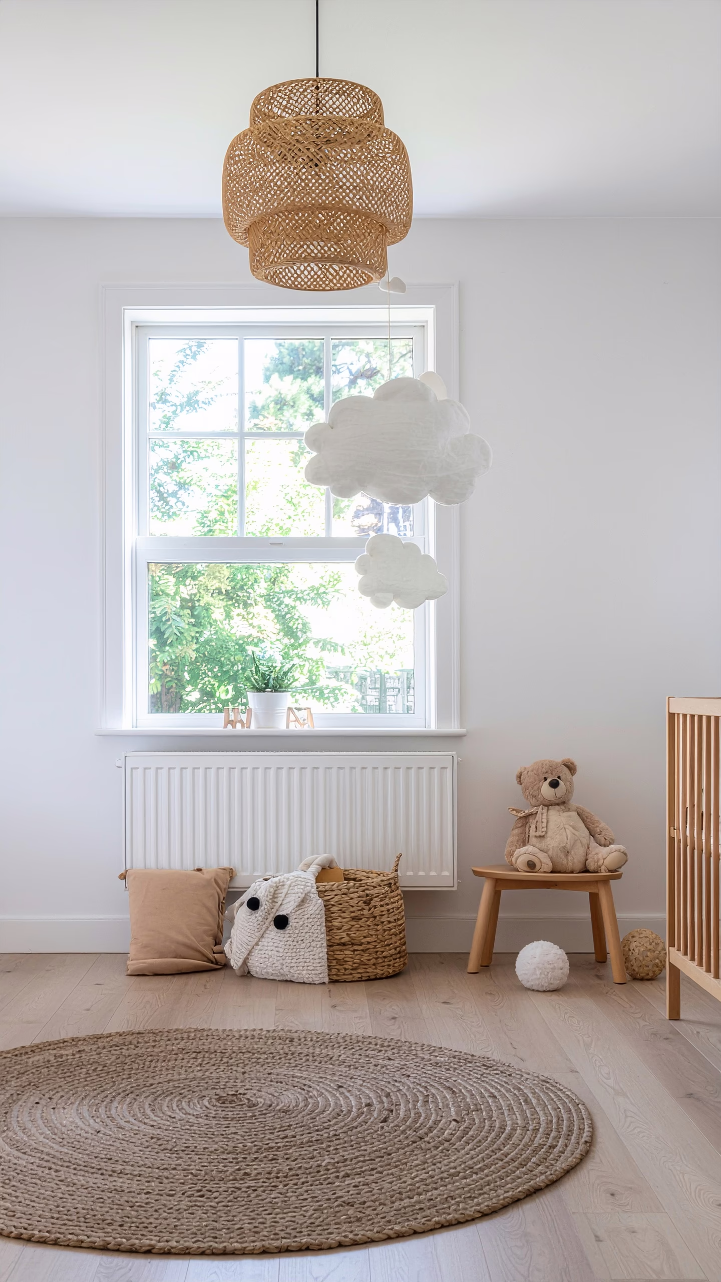 Discover a beautifully lit children's room featuring a cozy and minimalist design. The space includes a circular natural fiber rug on light wooden flooring, complemented by a woven basket filled with cushions. A plush teddy bear sits on a wooden stool next to the crib. A wicker ceiling lamp hangs, c
