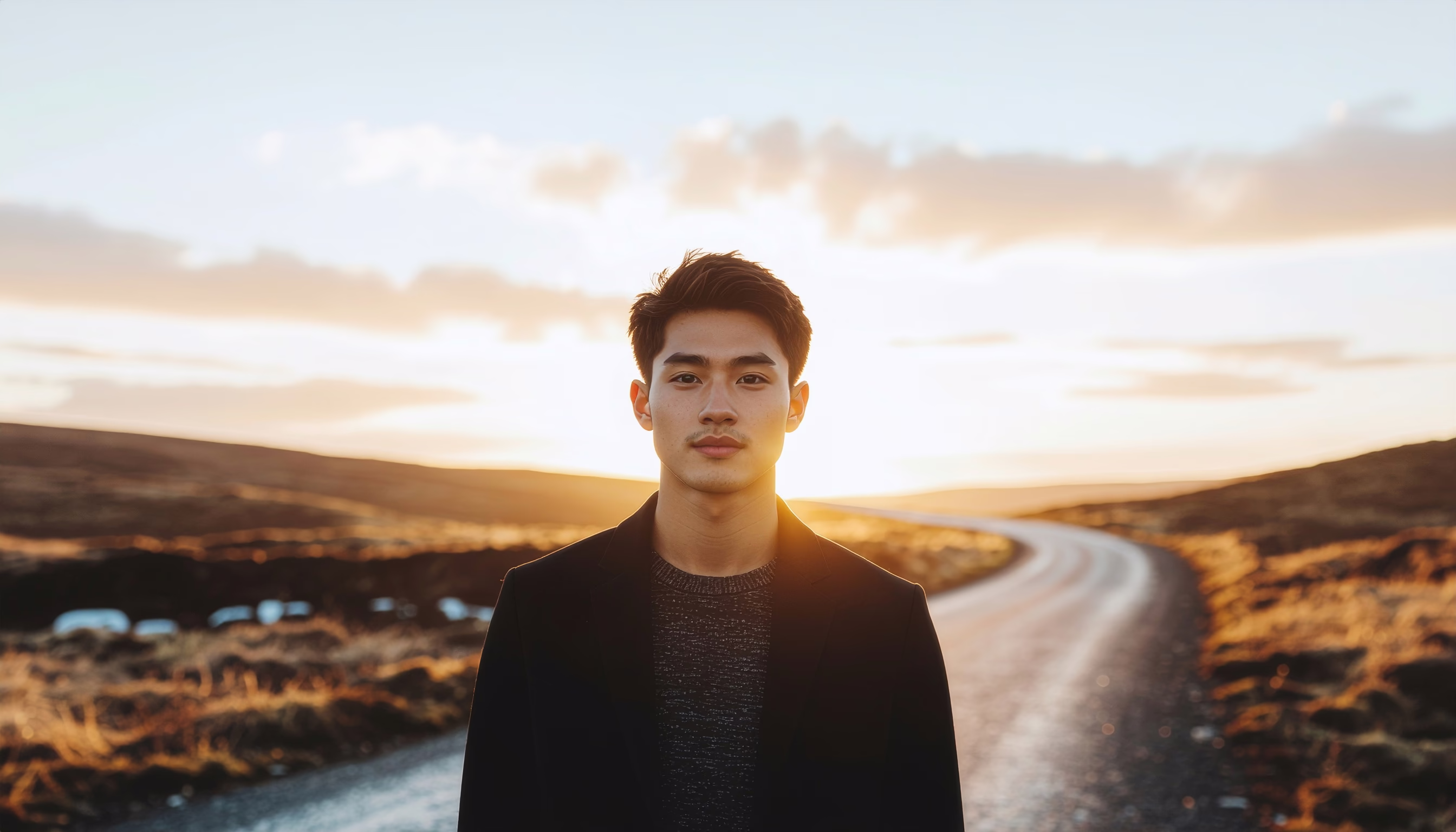 A captivating portrait of a young man standing on a rural road during sunset, embodying a moment of contemplation and serenity in a natural setting bathed in golden light. Perfect for those seeking in...