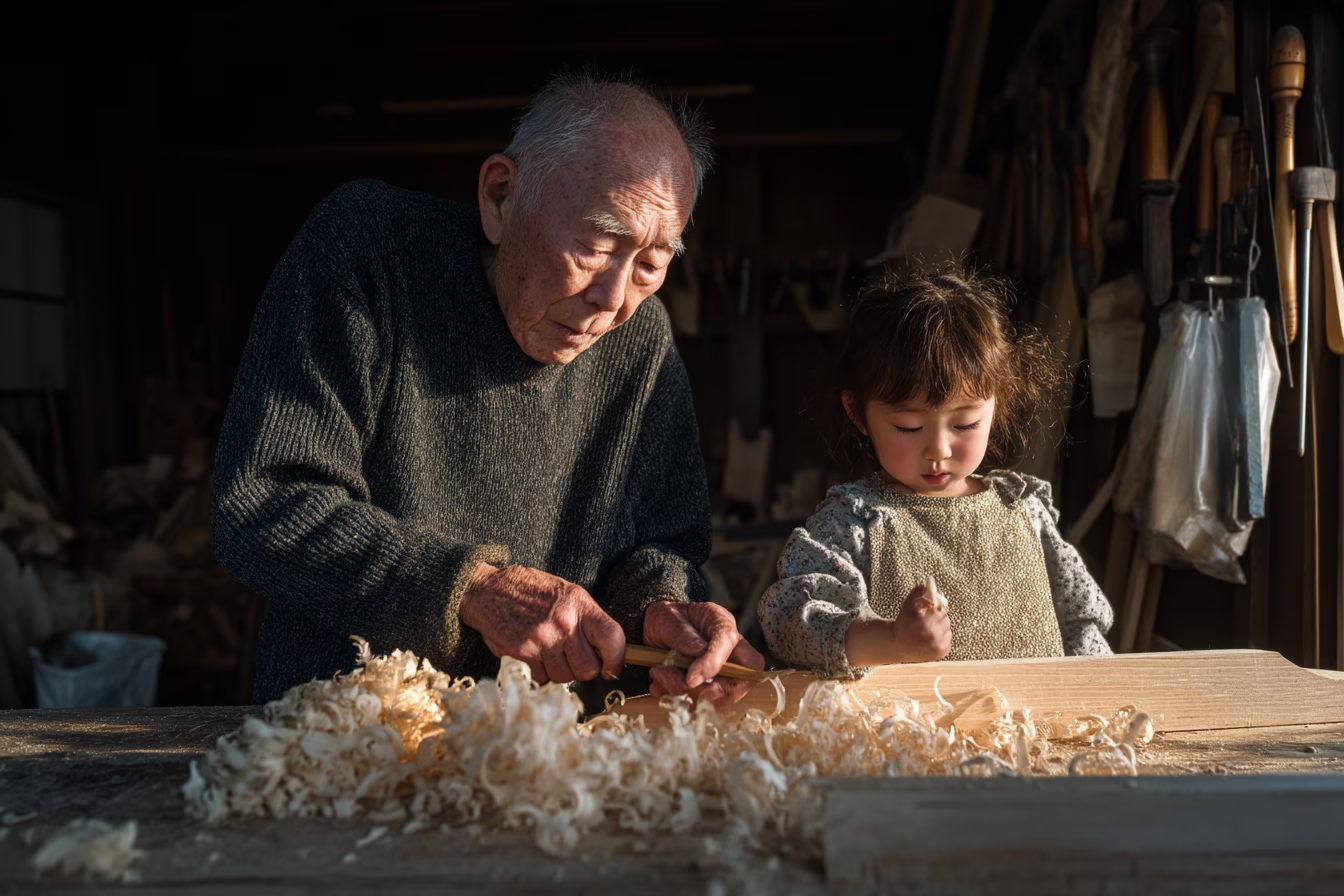 Elderly Man and Child Collaborating in a Woodworking Workshop