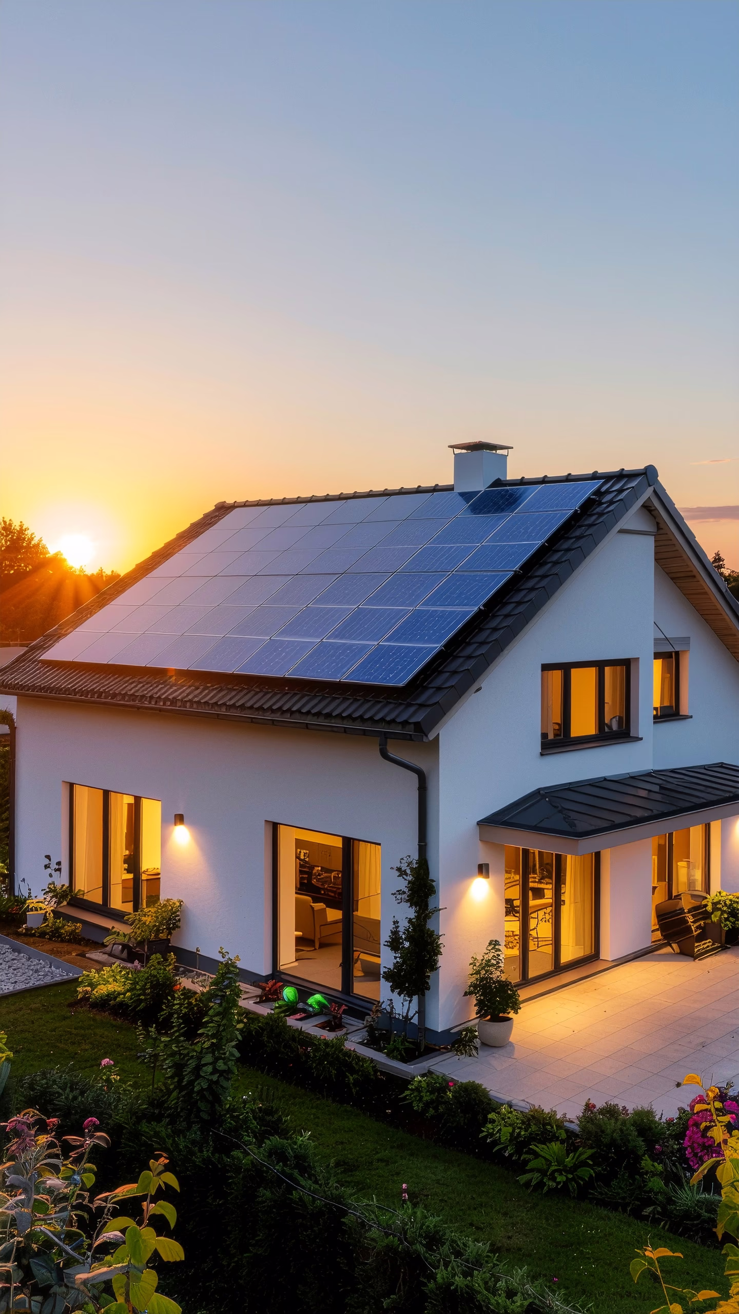 Discover this modern house featuring solar panels, surrounded by a lush garden and illuminated by warm lights, creating a cozy atmosphere. Perfect for eco-conscious buyers looking for sustainable living options.