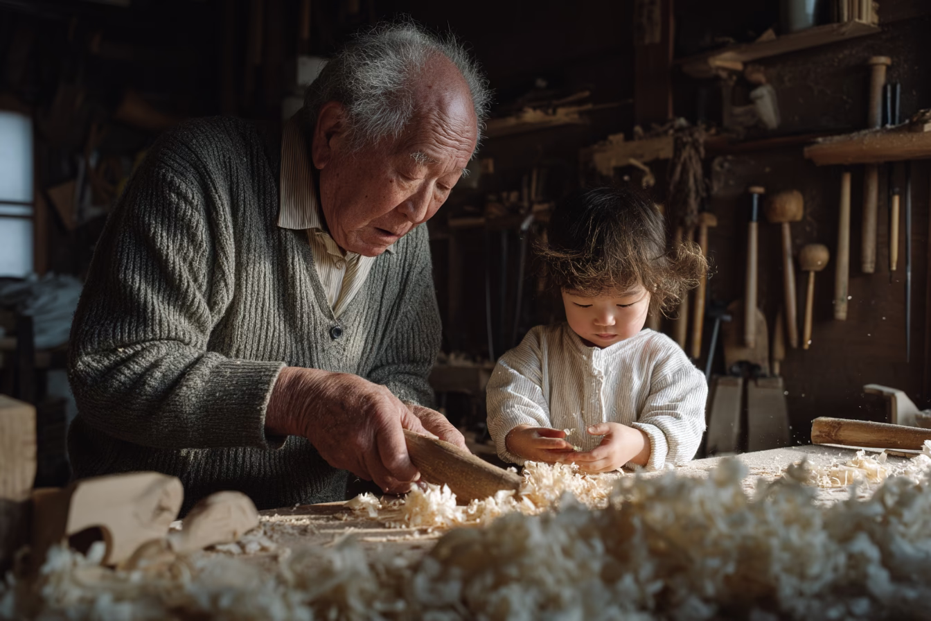 This image captures a softly lit woodworking workshop where a grandfather and his grandchild are engaged in a moment of learning and creativity. The grandfather is using a wooden tool while the child attentively holds small pieces of wood. The predominant earthy colors, including shades of brown, be