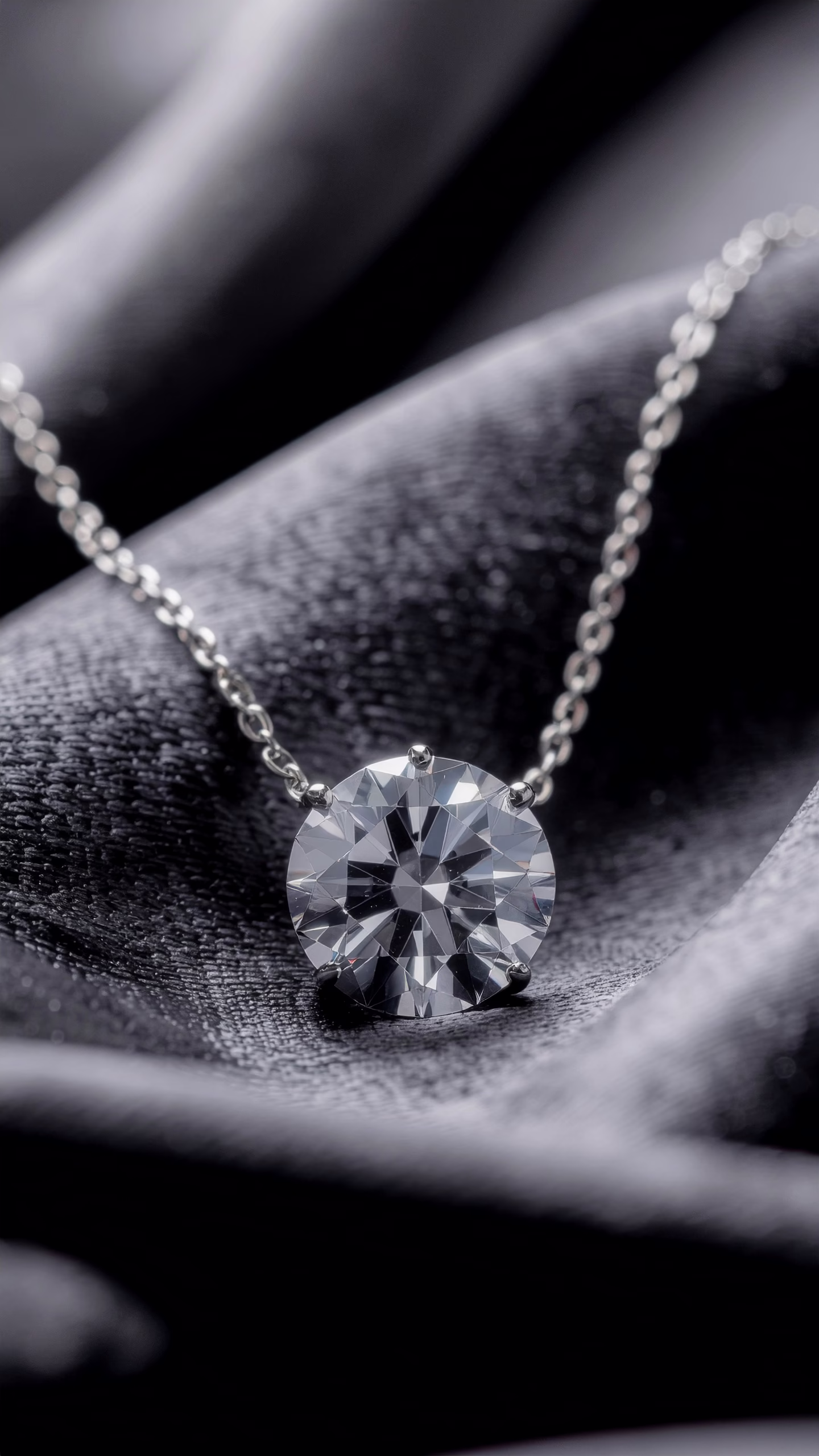 Discover this elegant silver necklace featuring a stunning cut diamond, beautifully showcased against a dark fabric background. The soft lighting enhances the sparkle and intricate details of the gemstone, creating a sophisticated contrast with the texture of the fabric in a macro shot. Perfect for