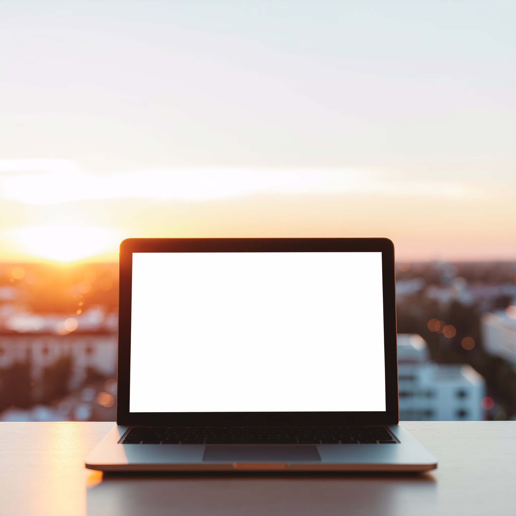 A sleek laptop with a blank screen is placed on a desk, set against a backdrop of a city at sunset. The natural lighting creates a soft contrast between the dark device and the orange sky. This minimalist composition focuses on the laptop, with a beautiful blur of the horizon in the background, evok