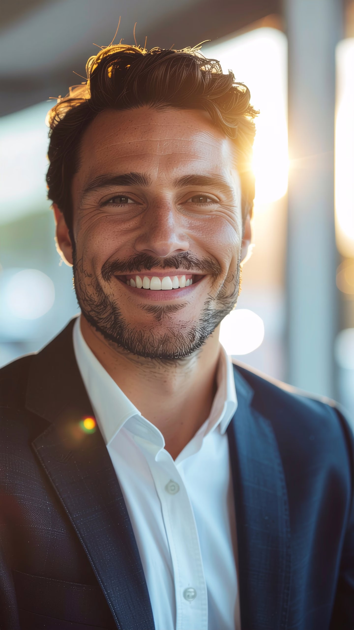 This portrait features a smiling man in an urban environment during sunset, with soft lighting accentuating his face and hair. Dressed in a dark suit and white shirt, he exudes elegance and confidence...