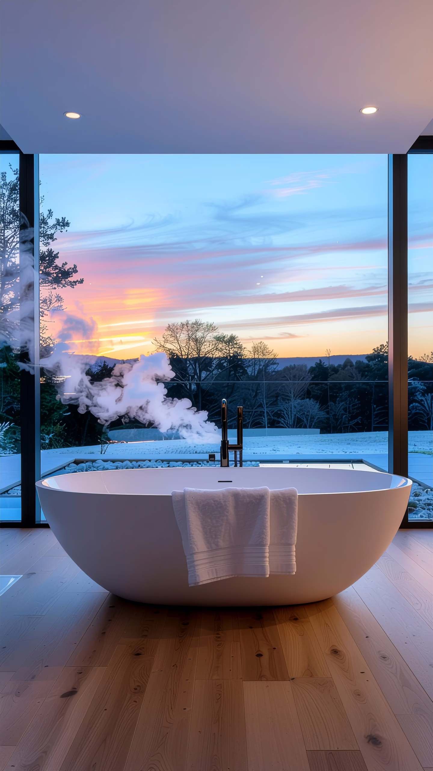 Discover this elegant white bathtub set in a modern environment featuring light wooden flooring and a large window showcasing a vibrant sunset in shades of blue and orange. Perfect for creating a sere...