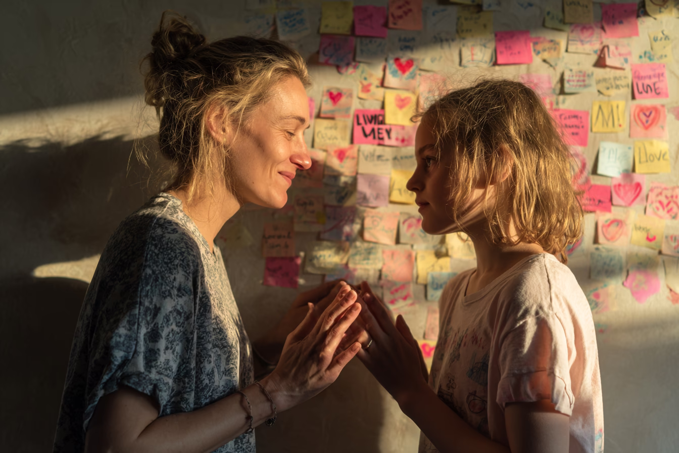 A mother and her daughter share a tender moment in front of a wall covered with colorful notes filled with messages of love and support. This image beautifully captures the emotional connection and warmth between them, illuminated by soft natural light.