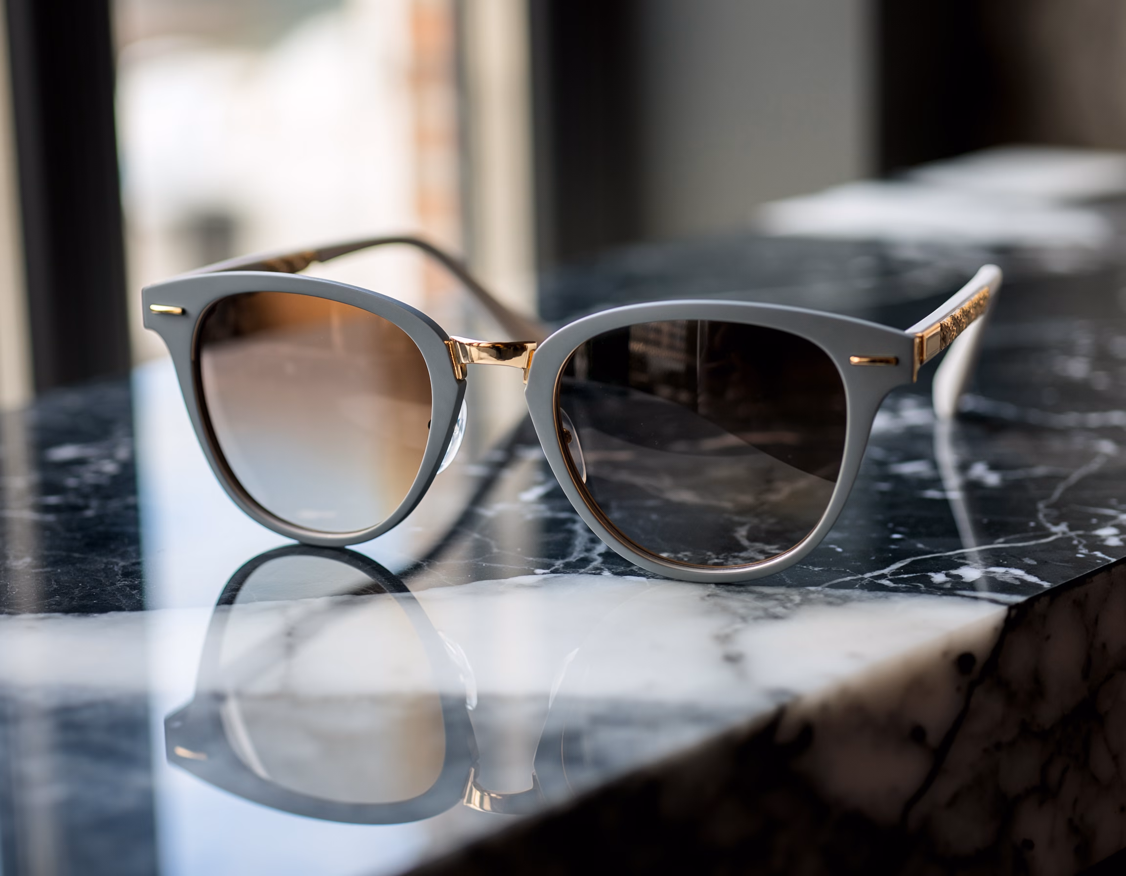 Discover these stylish gray sunglasses featuring elegant gold accents, beautifully displayed on a black marble surface with white veins. Perfect for adding a touch of sophistication to your look while enjoying the natural light around you.