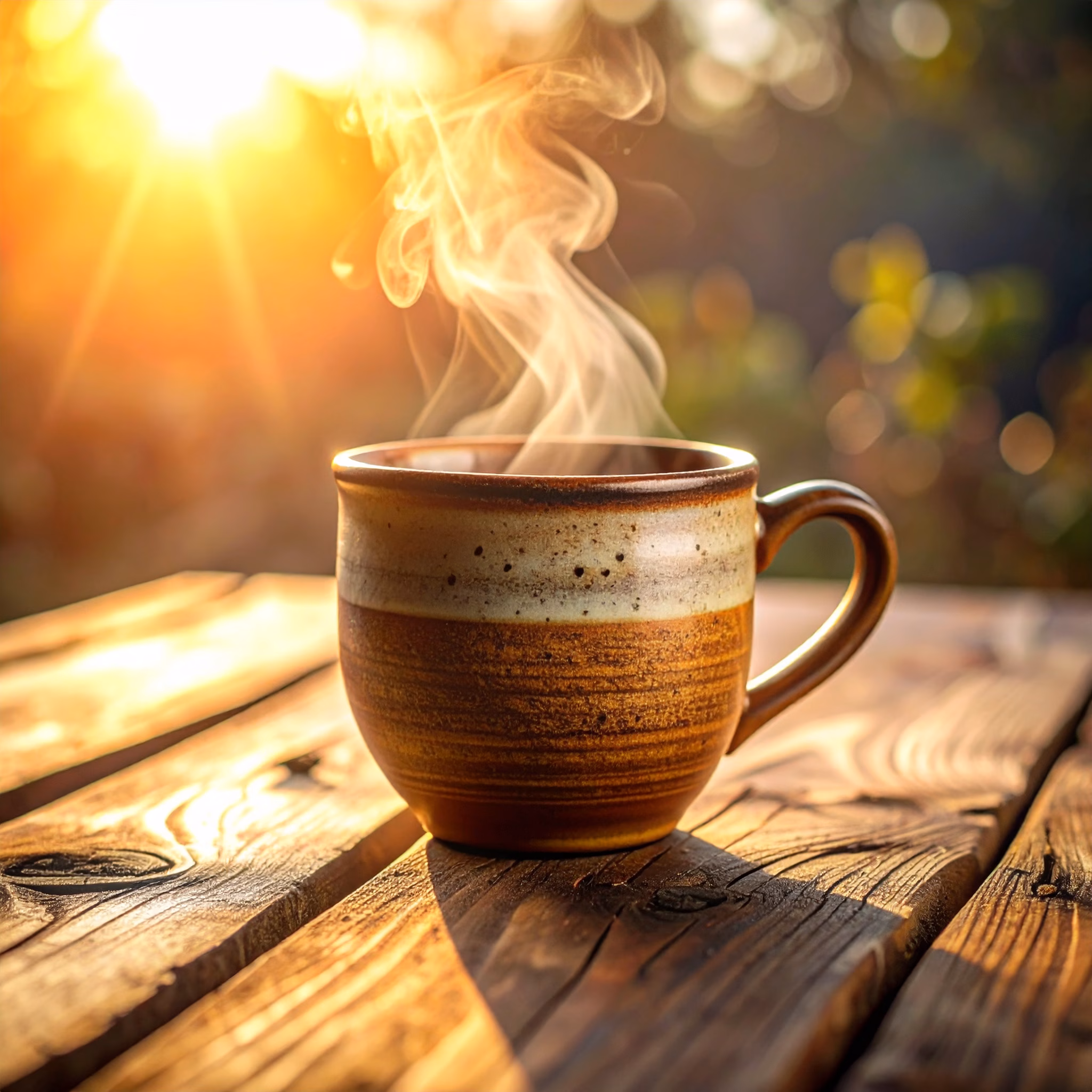 Experience the warmth and tranquility of a rustic ceramic mug filled with steaming coffee, perfectly placed on a wooden table at sunrise. This serene outdoor scene captures the essence of a sunny morn...