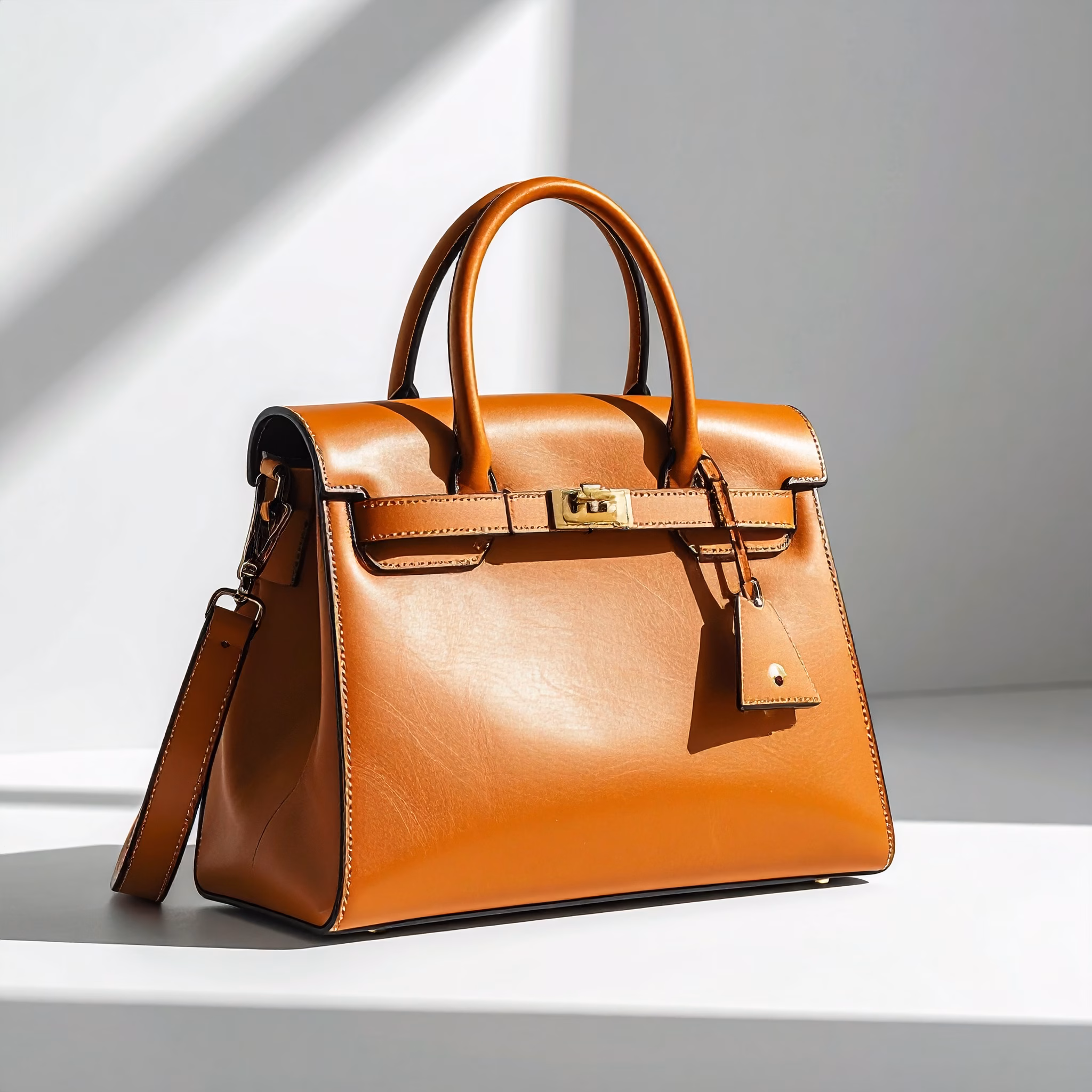 Discover this elegant light brown leather handbag featuring a glossy finish, beautifully contrasted against a minimalist white background. The soft lighting creates subtle shadows, enhancing its sophisticated atmosphere. Perfect for any stylish occasion.